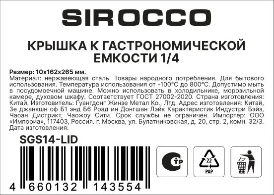Крышка для гастроемкости нержавеющая сталь 1/4