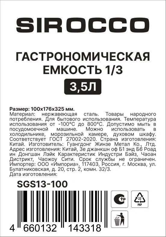 Гастроемкость нержавеющая сталь 1/3 100мм, 3.5л