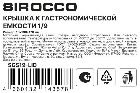 Крышка для гастроемкости нержавеющая сталь 1/9