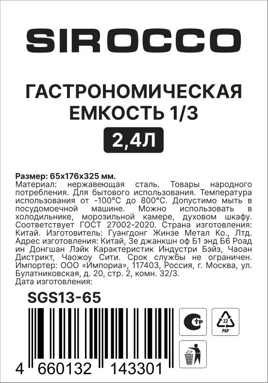 Гастроемкость нержавеющая сталь 1/3 65мм, 2.4л