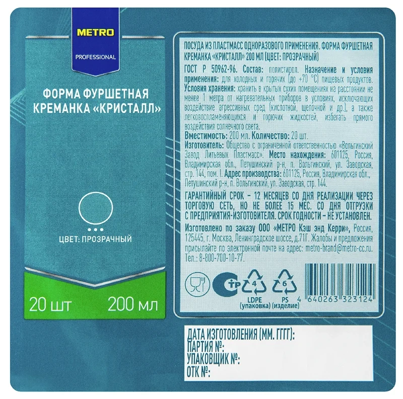 Одноразовые изделия изготовлены из безопасного плотного пищевого пластика, что обеспечивает сохранение формы на протяжении всего мероприятия. Они предназначены для использования с холодными и горячими пищевыми продуктами (до +75°C).