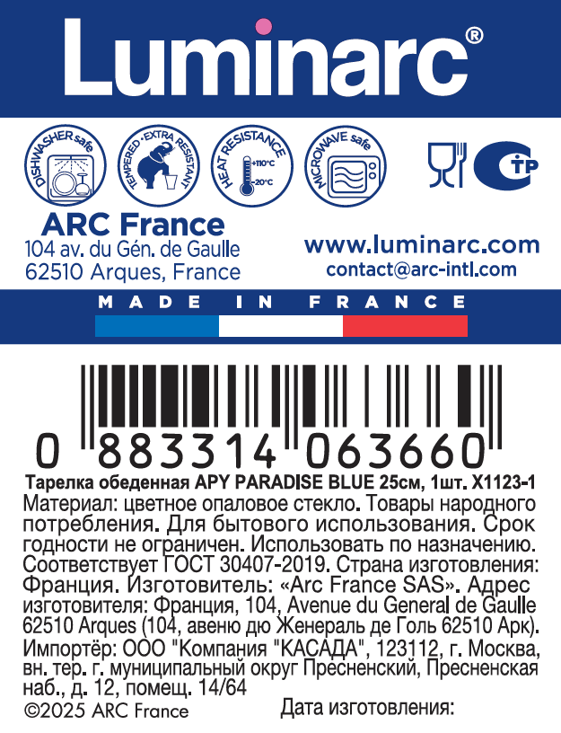 Тарелка обеденная Luminarc Apy Paradise Blue, 25см