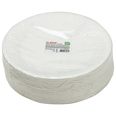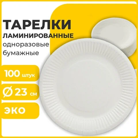 Подходят как для холодных, так и для горячих блюд (до+70 °С). Предназначены для корпоративных мероприятий любого формата, выездов на природу, пикников. Можно использовать для разогрева еды в микроволновой печи. Изготовлены из ламинированной бумаги белого цвета. Диаметр тарелок 230 мм, поставляются в комплекте 100 штук.