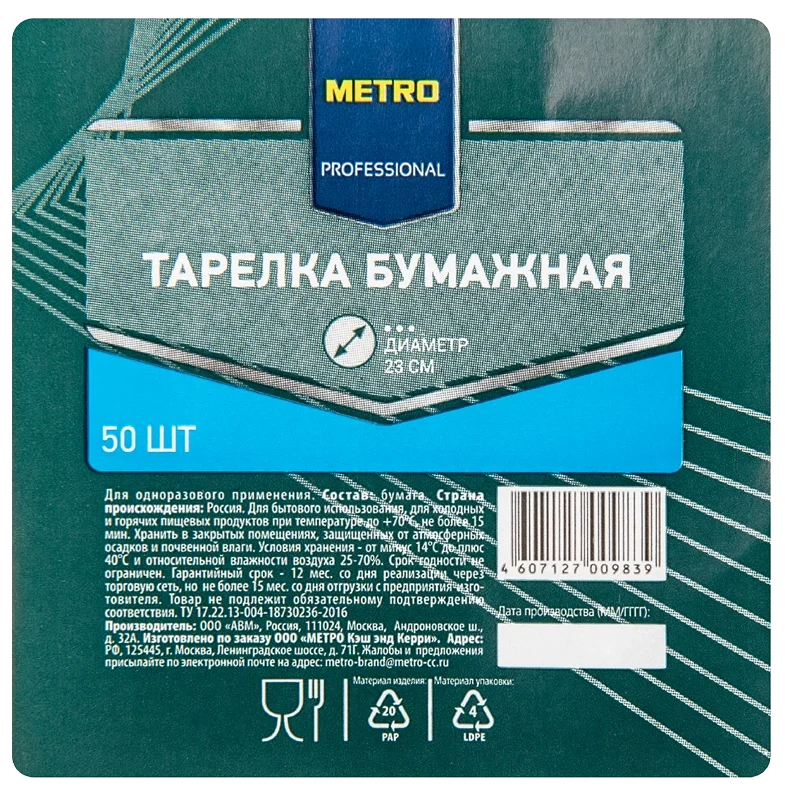 METRO PROFESSIONAL Тарелки для праздника бумажные, 23 см, 50 шт. прекрасно подойдут для пикника или домашнего праздника. Они предназначены для одноразового использования, поэтому их не нужно мыть. Изделия изготовлены из экологически чистого бумажного волокна, за счет чего еда в них не изменяет вкус и аромат. В них можно помещать горячую пищу или использовать для разогрева блюд в микроволновой печи. В упаковке – 50 тарелок. Одной пачки вполне хватит, чтобы накрыть стол на целую компанию.