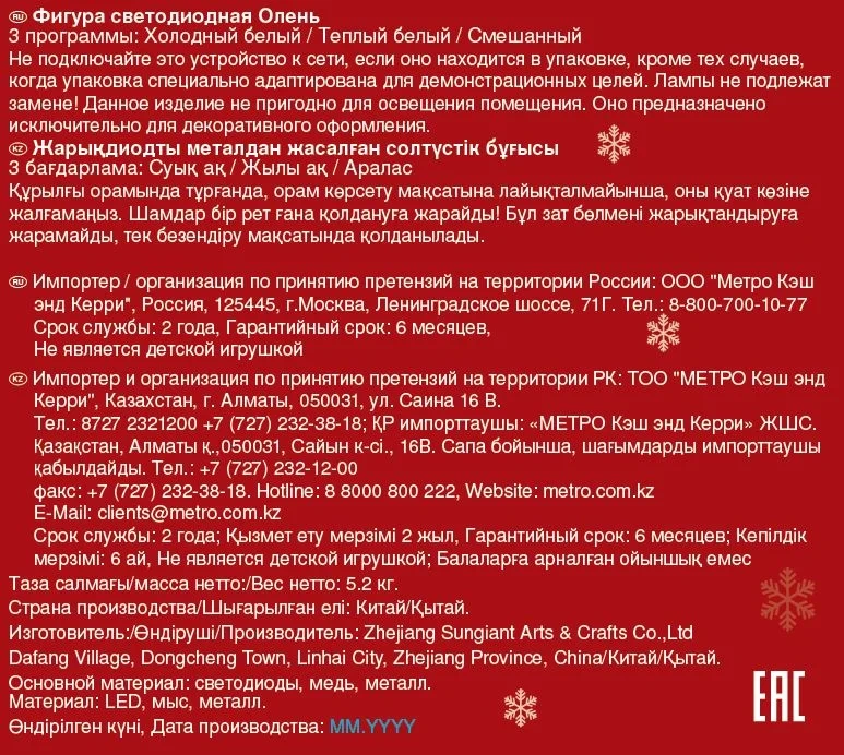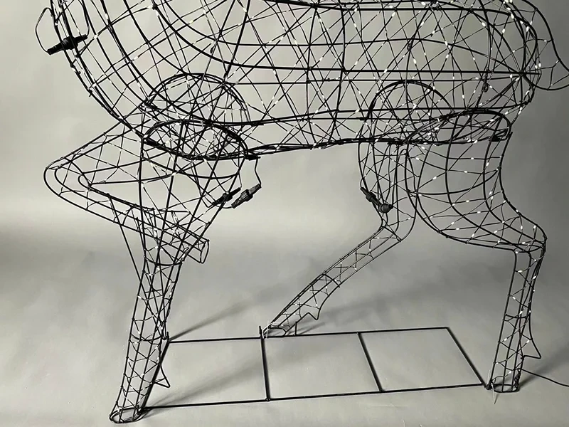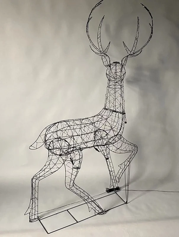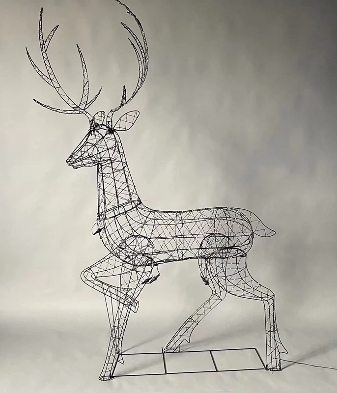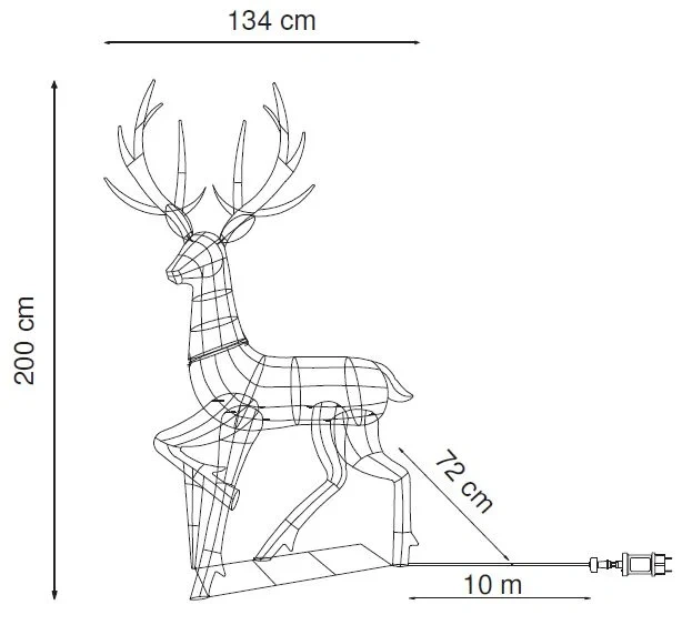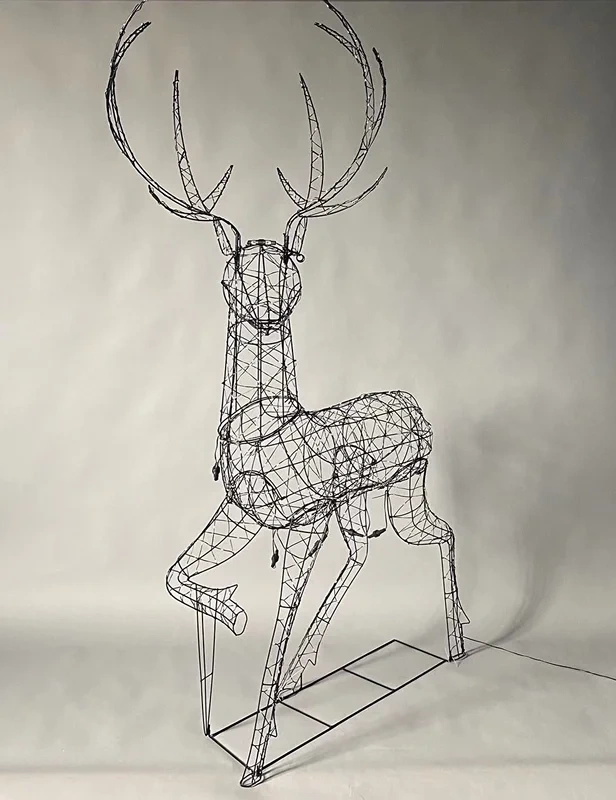 Величественный световой олень высотой 190 см станет доминантой вашего праздничного убранства. Семьсот пятьдесят светодиодов с переключением между теплым и холодным белым свечением позволяют создавать разную атмосферу — от уютного золотистого сияния до зимнего ледяного свечения. Три режима работы открывают возможность менять настроение подсветки в соответствии с вашим желанием. Прочная металлическая конструкция с медными элементами и разборной системой гарантирует устойчивость и удобство хранения. Защита IP44 обеспечивает бесперебойную работу под открытым небом в любую зимнюю погоду. Длинный кабель питания 10 метров и безопасное напряжение 4.5В позволяют установить фигуру в любом уголке сада, а энергопотребление всего 6.75 Вт делает эксплуатацию экономичной. Солидный вес 5.2 кг придает оленю устойчивость, а его внушительные размеры и роскошная двойная подсветка превратят ваше пространство в волшебную зимнюю резиденцию.
