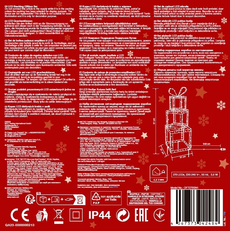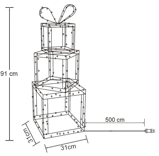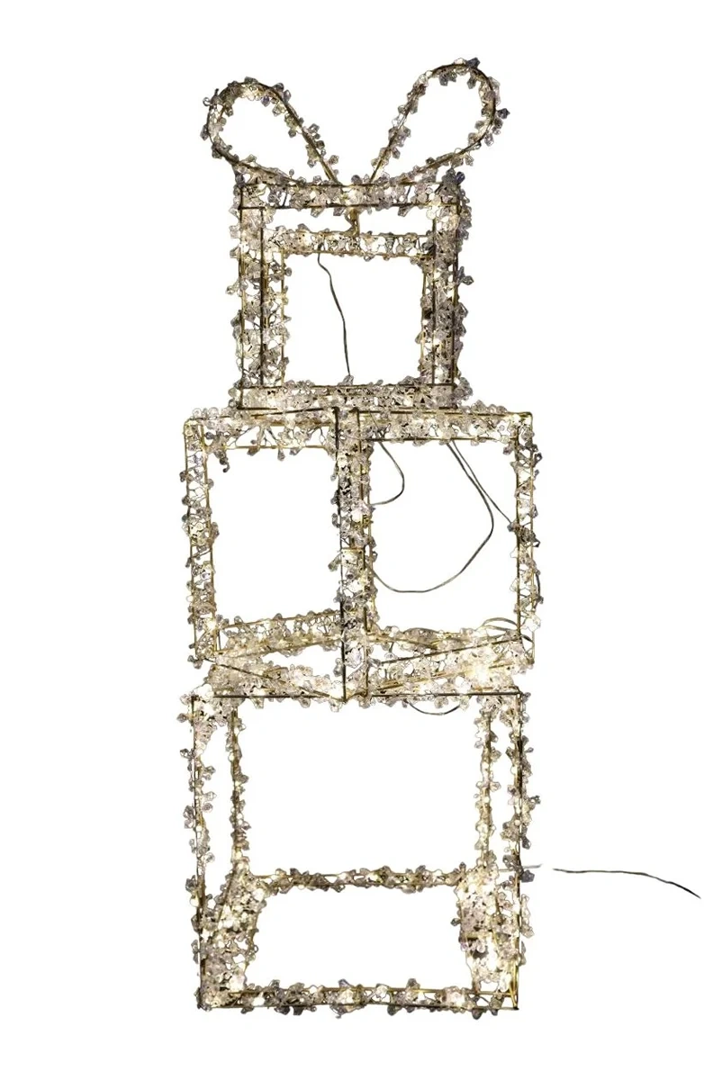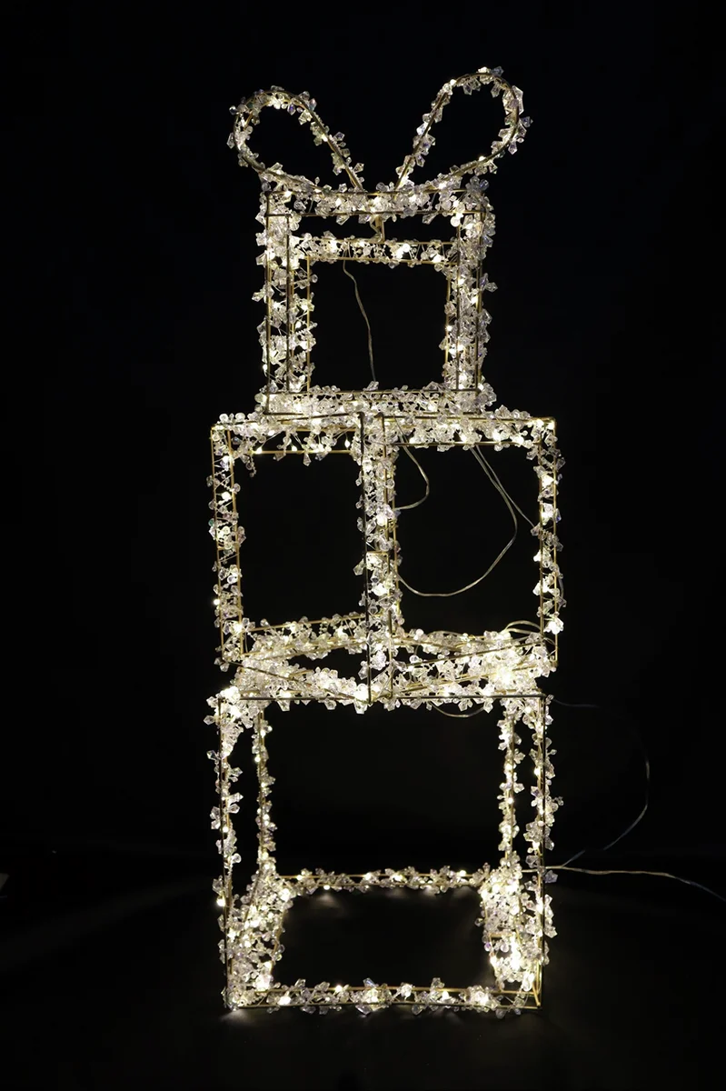 Элегантная композиция из трех праздничных коробок-подарков станет ярким акцентом вашего новогоднего декора. Пирамида из коробок высотой 34 см, 26 см и 21 см собрана в единую конструкцию общей высотой 91 см и украшена 270 теплыми белыми светодиодами, создающими равномерное мягкое свечение. Прочная металлическая основа с элементами из ПВХ и меди обеспечивает устойчивость и долговечность, а степень защиты IP44 позволяет размещать композицию как в интерьере, так и на улице. Длинный кабель питания 5 метров и безопасное напряжение 4.5В обеспечивают удобное подключение, а энергоэффективная конструкция потребляет всего 3.6 Вт. Эта стильная световая пирамида станет универсальным украшением для вашего дома, сада или витрины, наполняя пространство теплом и праздничной атмосферой.
