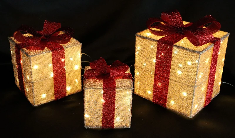 Очаровательная композиция из трех праздничных коробок-подарков разного размера создаст уютную атмосферу как в интерьере, так и на улице. Набор включает коробки высотой 32 см, 24 см и 20 см, украшенные в общей сложности 80 мини-светодиодами теплого белого свечения, которые создают мягкое мерцание, напоминающее огоньки на настоящей праздничной упаковке. Прочная металлическая конструкция с элементами из меди и декоративной тканью обеспечивает долговечность, а защита IP44 позволяет использовать композицию под открытым небом. Длинный кабель питания 5 метров и безопасное напряжение 4.5В дают свободу для размещения — у камина, на веранде или в саду. Элегантное сочетание классического дизайна и современной подсветки делает эти светящиеся подарки универсальным украшением, которое наполнит ваш дом ожиданием праздничного волшебства.