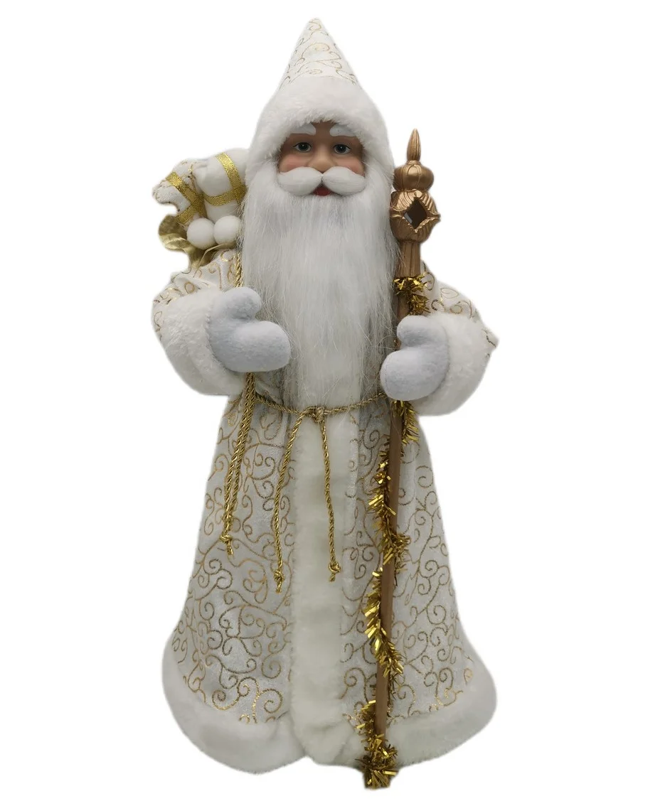 Добрый символ Рождества для вашего дома! Фигура Санты высотой 45 см выполнена с удивительной детализацией — от пушистой белой бороды до традиционного красного костюма с меховой отделкой. Изготовлена из качественных материалов (текстиль и пластик), что делает ее прочной и безопасной. Идеально размещается под елкой, на камине или праздничном столе, создавая теплое праздничное настроение. Прекрасный подарок для сохранения семейных рождественских традиций!