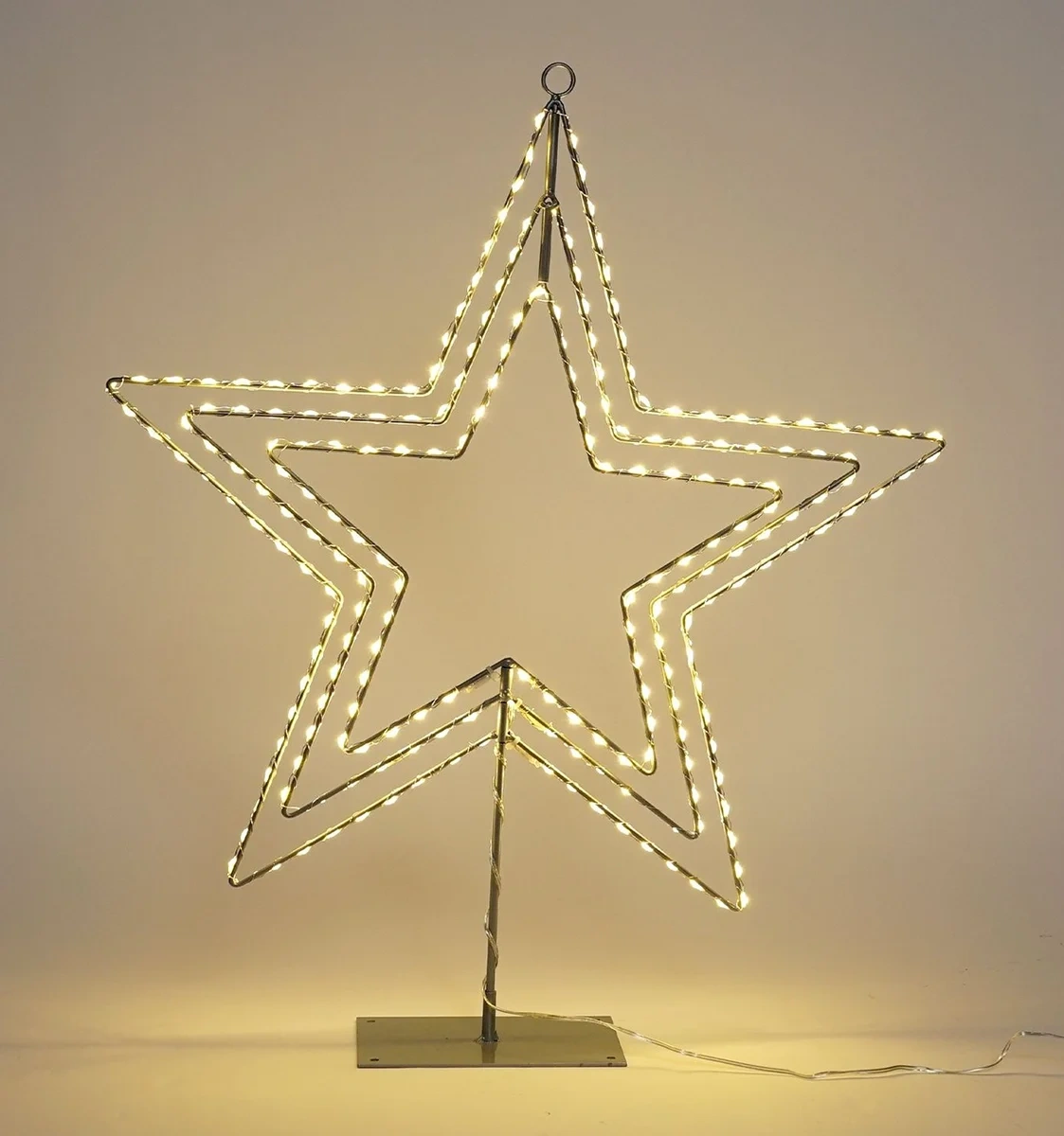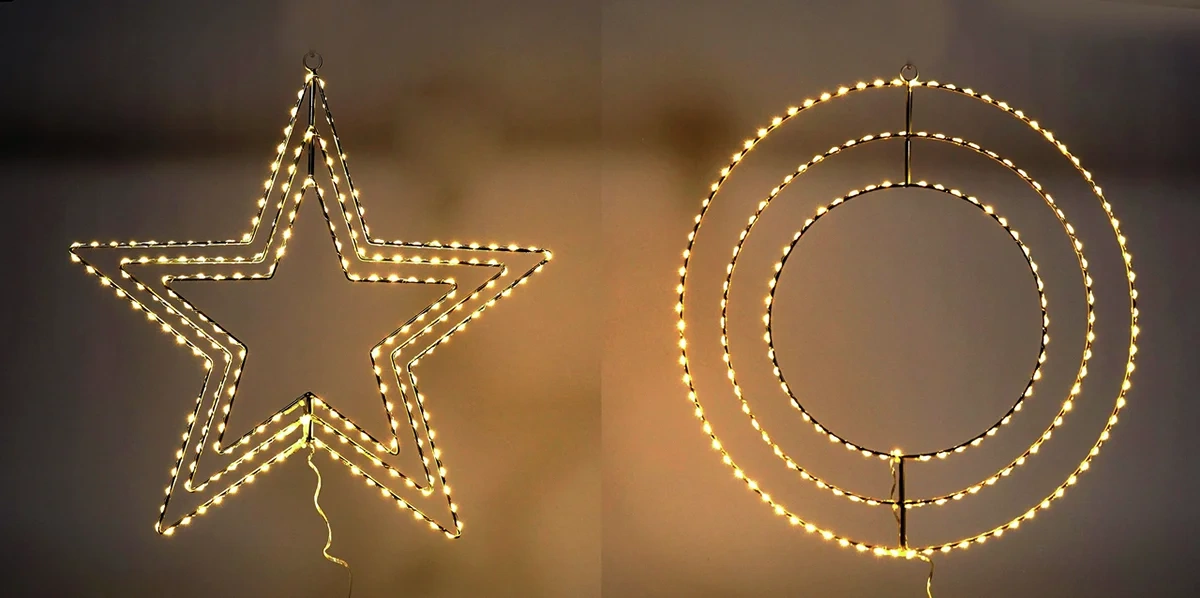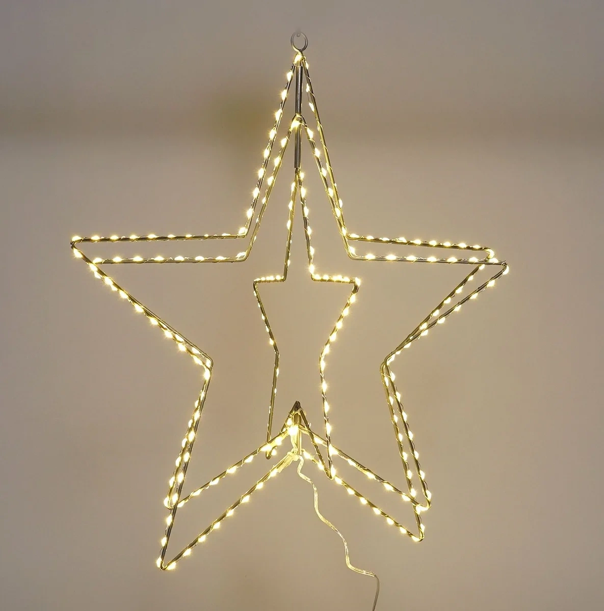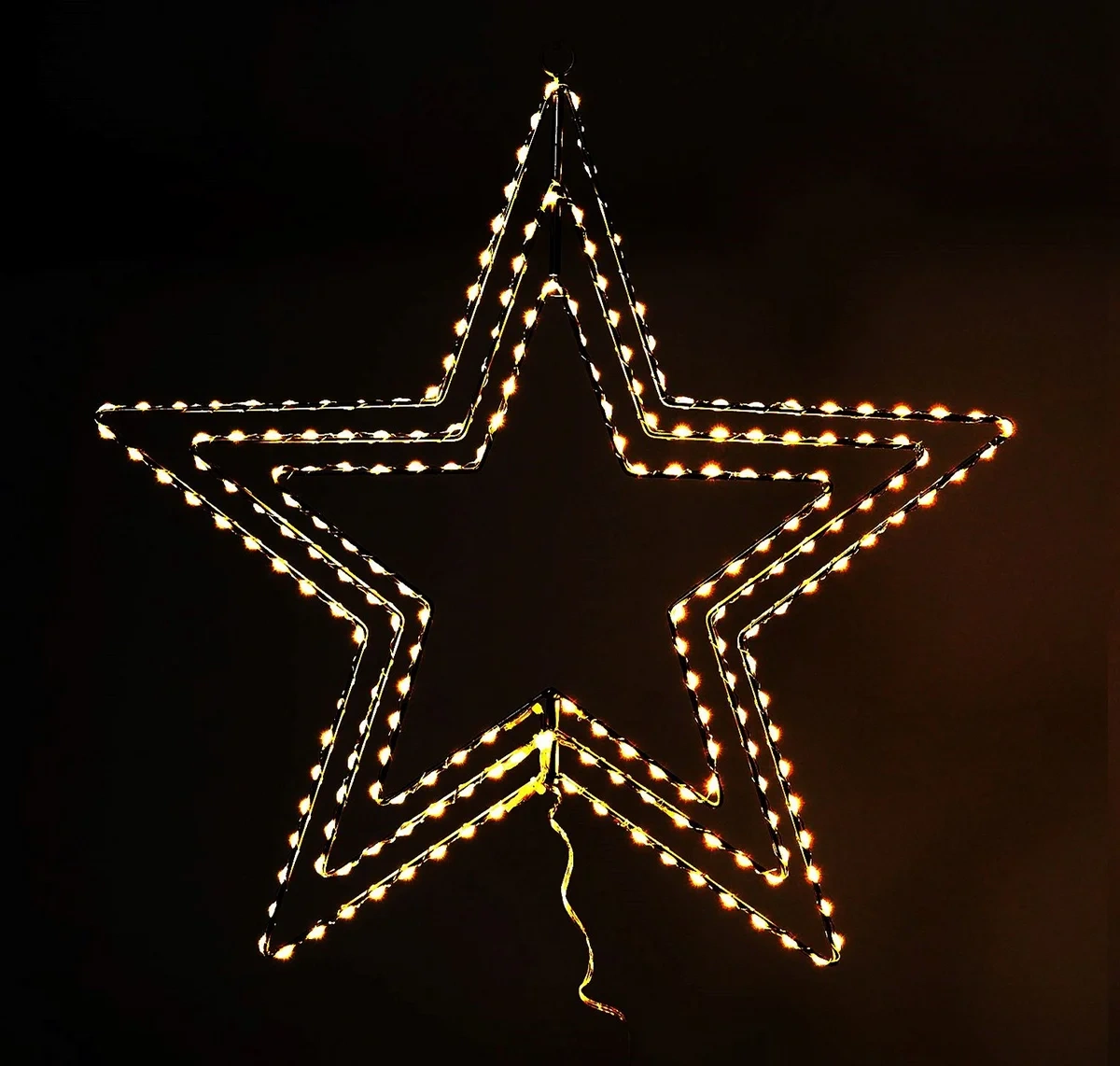 Универсальная световая звезда диаметром 50 см с возможностью использования в двух вариантах: для подвешивания с функцией вращения на 360 или как настольная композиция со специальной подставкой. Сто девяносто два теплых белых светодиода создают мягкое равномерное свечение, превращая звезду в эффектный праздничный акцент. Прочная железная конструкция с медными элементами обеспечивает долговечность, а вращающийся механизм позволяет любоваться сиянием с любого ракурса. Защита IP44 позволяет размещать звезду как в интерьере, так и под открытым небом. Компактный кабель длиной 3 метра и безопасное напряжение 4.5В обеспечивают удобство использования, а энергопотребление всего 6 Вт делает эксплуатацию экономичной. Небольшой вес (1.5 кг) и продуманная конструкция делают эту сияющую звезду идеальным решением для украшения елки, создания рождественской композиции на столе или подвешивания у входа в дом.