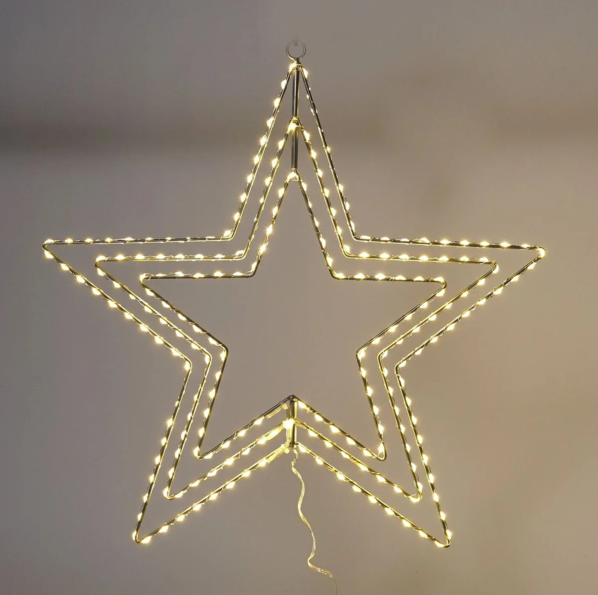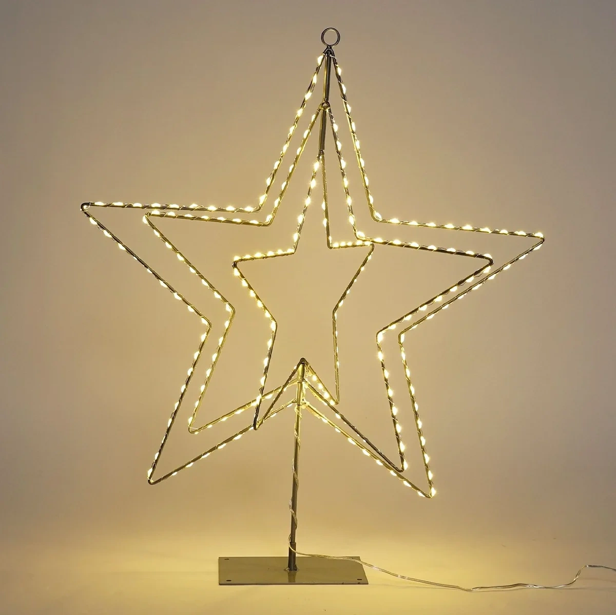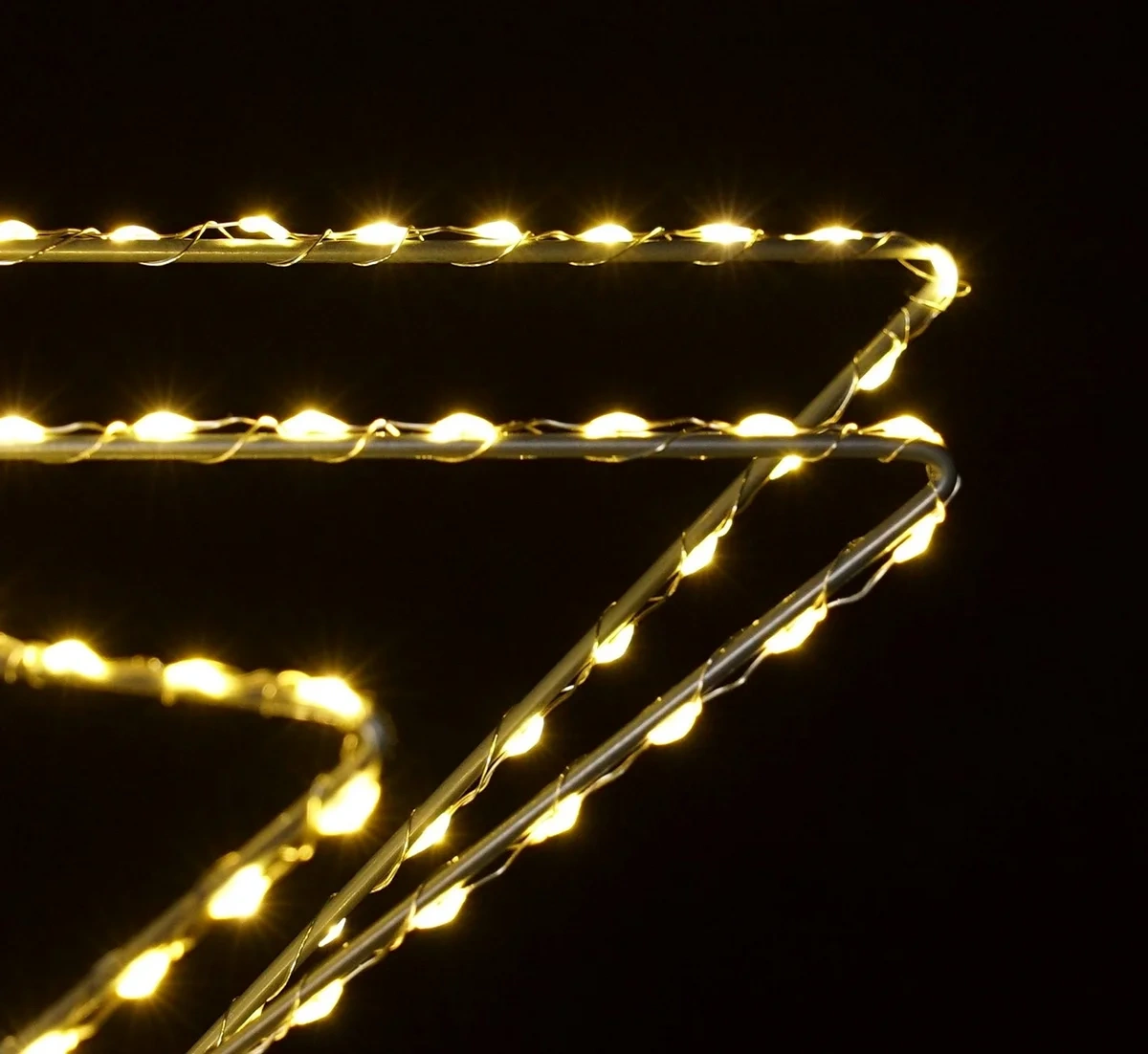 Универсальная световая звезда диаметром 50 см с возможностью использования в двух вариантах: для подвешивания с функцией вращения на 360 или как настольная композиция со специальной подставкой. Сто девяносто два теплых белых светодиода создают мягкое равномерное свечение, превращая звезду в эффектный праздничный акцент. Прочная железная конструкция с медными элементами обеспечивает долговечность, а вращающийся механизм позволяет любоваться сиянием с любого ракурса. Защита IP44 позволяет размещать звезду как в интерьере, так и под открытым небом. Компактный кабель длиной 3 метра и безопасное напряжение 4.5В обеспечивают удобство использования, а энергопотребление всего 6 Вт делает эксплуатацию экономичной. Небольшой вес (1.5 кг) и продуманная конструкция делают эту сияющую звезду идеальным решением для украшения елки, создания рождественской композиции на столе или подвешивания у входа в дом.