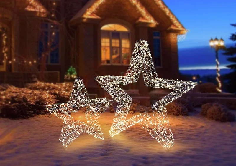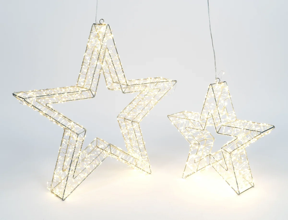 Пара роскошных световых звезд создаст эффектный дуэт в вашем праздничном оформлении. Композиция включает большую звезду диаметром 50 см с 1200 светодиодами и малую звезду диаметром 32 см с 600 светодиодами, вместе образующими 1800 точек теплого белого свечения. Железная конструкция обеспечивает прочность и устойчивость, а частое расположение диодов (каждые 5 см) создает плотное равномерное сияние. Защита IP44 гарантирует бесперебойную работу под открытым небом в любую зимнюю погоду. Длинный кабель питания 5 метров и безопасное напряжение 24В позволяют легко выбрать место для размещения, а разная мощность звезд (12 Вт и 6 Вт) обеспечивает экономичную эксплуатацию. Небольшой общий вес 1.12 кг делает композицию мобильной, позволяя создать яркий акцент на фасаде, в саду или у входной группы. Эти сияющие звезды станут символом праздника, наполняя ваше пространство теплом и волшебством.