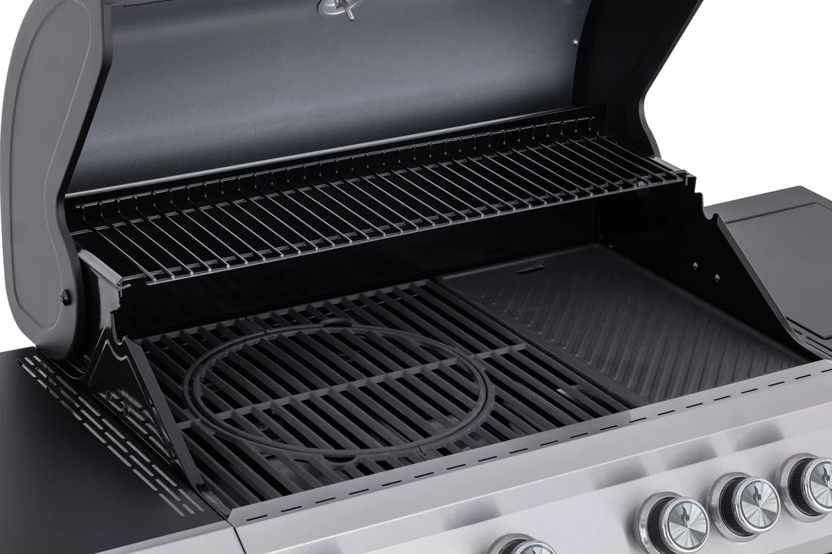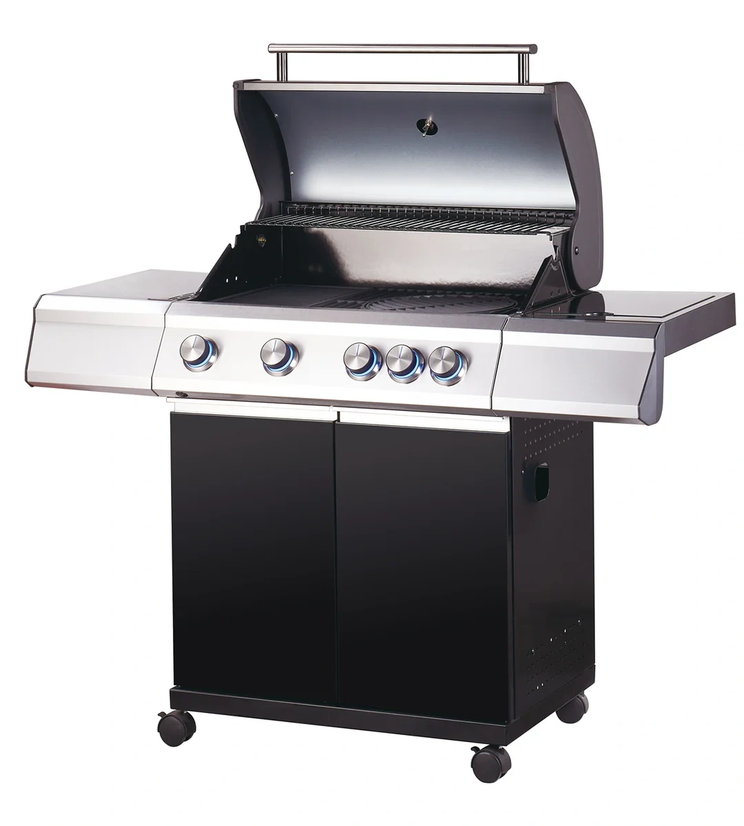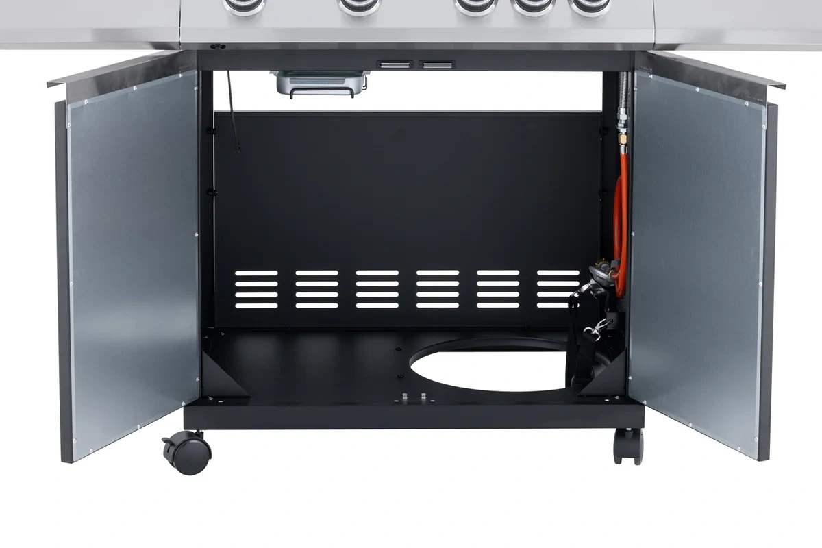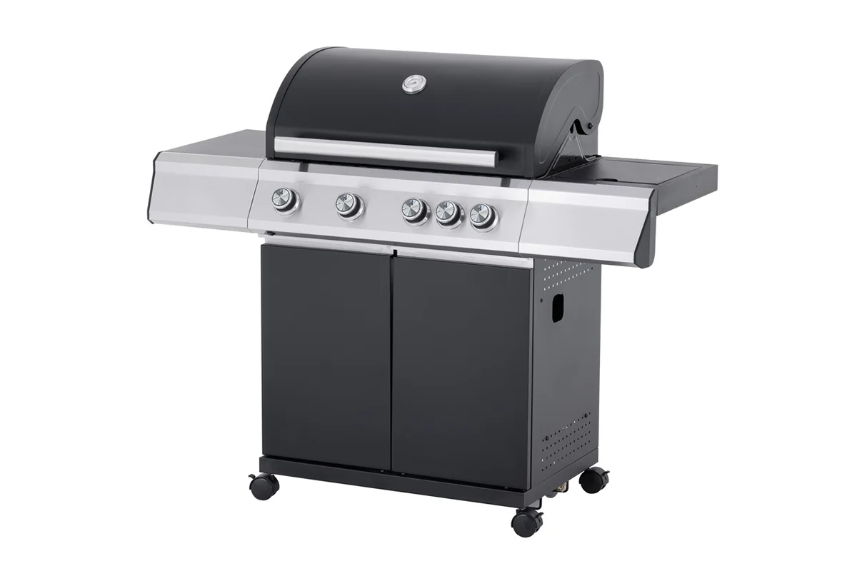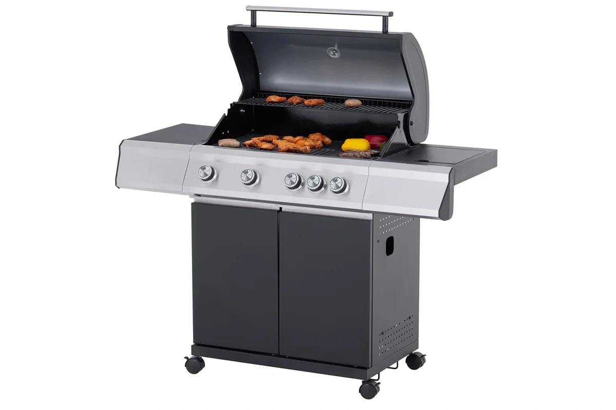 Газовый гриль Tarrington House Paxton 4+1 состоит из четырех компонентов: горелок, решеток для жарки, системы сбора жира и прочного основания. Пять горелок с автоматическим розжигом включаются при каждом повороте ручки. На крышке установлен термометр, с помощью которого удобно контролировать процесс приготовления. Это важно для блюд, требующих специальной прожарки. Основные характеристики и преимущества: Просторная рабочая поверхность. Гриль оснащен четырьмя горелками мощностью 3,5 кВт. Размер рабочей зоны составляет 71 x 41 см. Такой площади достаточно для приготовления большого количества блюд одновременно; Съемная чугунная решетка. Круглую часть над горелкой можно убирать. Это позволяет готовить в казане, сковороде WOK и другой посуде со сферическим дном; дополнительная горелка мощностью 3 кВт. Расположена сбоку, что позволяет готовить в сотейниках или сковородках. Горелка оптимальна для медленного томления блюд. Когда она отключена, то закрывается крышкой и может использоваться в качестве дополнительной рабочей зоны; Решетка для приготовления овощей. Расположена над основной поверхностью. Решетку можно использовать как для жарки, так и разогревания готовой еды; Плоский противень. Благодаря рифленой поверхности позволяет создать характерный рисунок на продуктах; Управление. Для каждой горелки спереди предусмотрен рычажок управления подачи газа. Плавная регулировка позволяет точно настроить интенсивность пламени. Рукоятки имеют большой диаметр и подсветку для комфортного использования вечером; Легкость в использовании и уходе. Электронный поджиг обеспечивает мгновенный и надежный запуск горелок. Гриль также можно разжечь с помощью спичек. Съемный поддон для сбора жира помогает быстро очистить устройство после использования; Маневренность. Колеса помогают легко перемещать модель при необходимости. На ролики дополнительно установлены фиксаторы, которые исключают самопроизвольное движение гриля; Дополнительные приспособления. На боковые столики можно поставить продукты и посуду. Специальные крючки на корпусе позволяют повесить полотенца, крышки, лопатки. Гриль поставляется в виде отдельных частей. Комплект включает в себя подробную пошаговую инструкцию по сборке, а также пять алюминиевых одноразовых накопителей жира. Вес продукта: 44 кг. Для работы гриля Tarrington House Paxton 4+1 необходимо использовать баллон с газом, наполненный пропаном или бутаном. Он устанавливается внутри корпуса. Специальное углубление обеспечивает надежную фиксацию баллона, исключает его случайное опрокидывание. Газовые баллоны с пропаном можно использовать круглый год. Бутан оптимален для летнего периода, поскольку топливо теряет эффективность при температуре ниже +10С. Газовый гриль Tarrington House Paxton 4+1 нагревается быстро. Если закрыть крышку, то начать приготовление можно уже через несколько минут после включения.