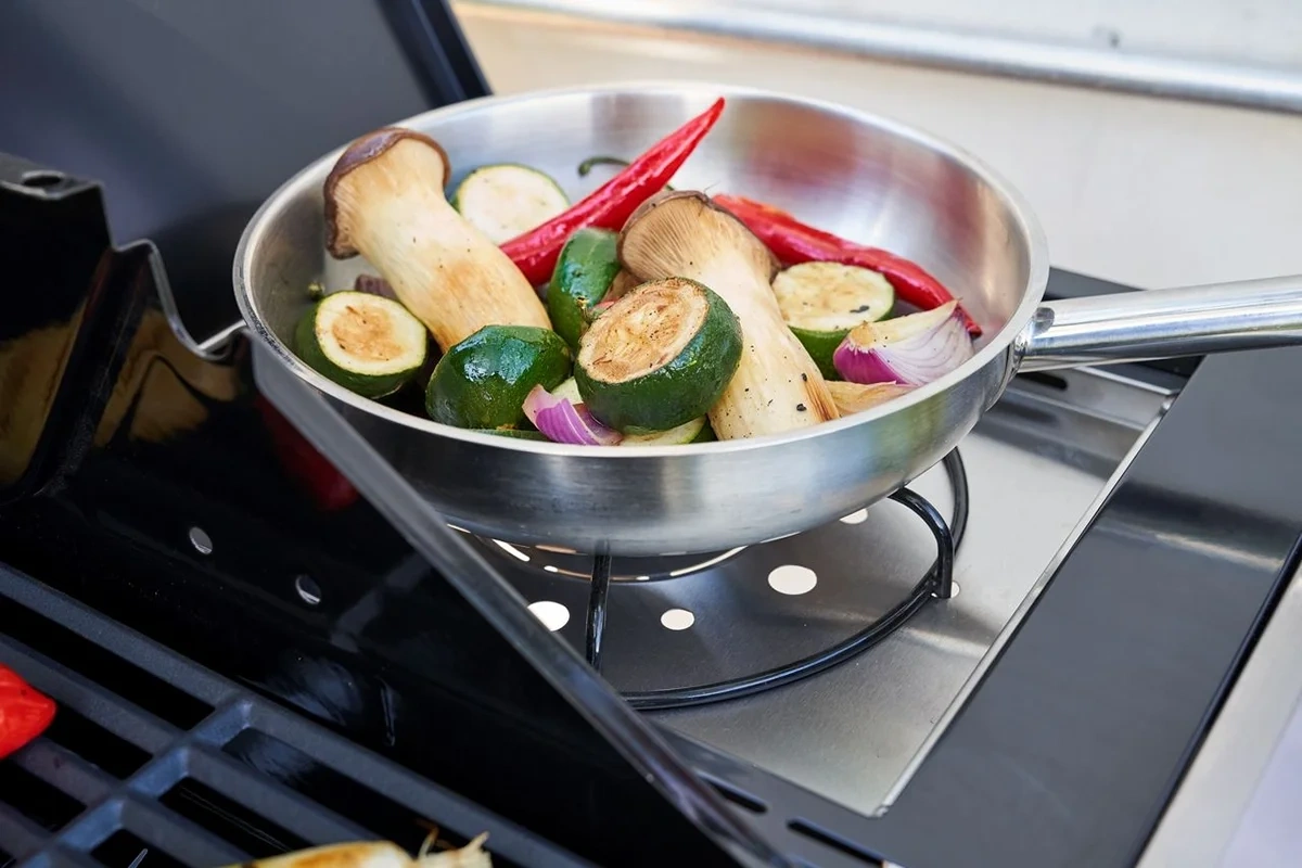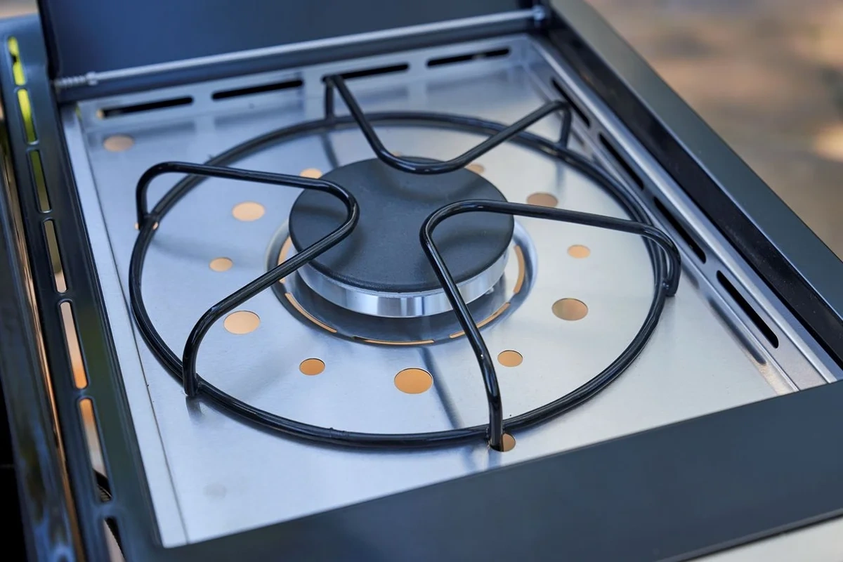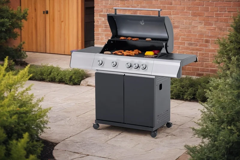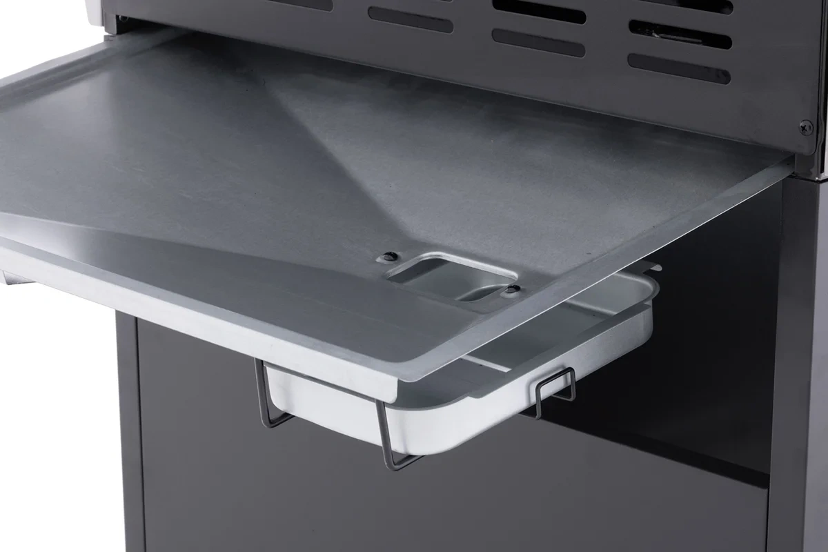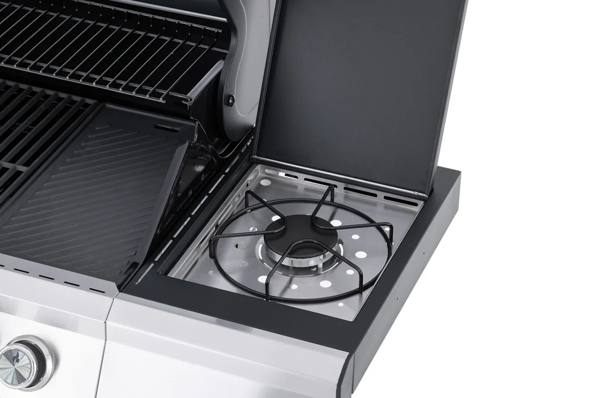 Газовый гриль Tarrington House Paxton 4+1 состоит из четырех компонентов: горелок, решеток для жарки, системы сбора жира и прочного основания. Пять горелок с автоматическим розжигом включаются при каждом повороте ручки. На крышке установлен термометр, с помощью которого удобно контролировать процесс приготовления. Это важно для блюд, требующих специальной прожарки. Основные характеристики и преимущества: Просторная рабочая поверхность. Гриль оснащен четырьмя горелками мощностью 3,5 кВт. Размер рабочей зоны составляет 71 x 41 см. Такой площади достаточно для приготовления большого количества блюд одновременно; Съемная чугунная решетка. Круглую часть над горелкой можно убирать. Это позволяет готовить в казане, сковороде WOK и другой посуде со сферическим дном; дополнительная горелка мощностью 3 кВт. Расположена сбоку, что позволяет готовить в сотейниках или сковородках. Горелка оптимальна для медленного томления блюд. Когда она отключена, то закрывается крышкой и может использоваться в качестве дополнительной рабочей зоны; Решетка для приготовления овощей. Расположена над основной поверхностью. Решетку можно использовать как для жарки, так и разогревания готовой еды; Плоский противень. Благодаря рифленой поверхности позволяет создать характерный рисунок на продуктах; Управление. Для каждой горелки спереди предусмотрен рычажок управления подачи газа. Плавная регулировка позволяет точно настроить интенсивность пламени. Рукоятки имеют большой диаметр и подсветку для комфортного использования вечером; Легкость в использовании и уходе. Электронный поджиг обеспечивает мгновенный и надежный запуск горелок. Гриль также можно разжечь с помощью спичек. Съемный поддон для сбора жира помогает быстро очистить устройство после использования; Маневренность. Колеса помогают легко перемещать модель при необходимости. На ролики дополнительно установлены фиксаторы, которые исключают самопроизвольное движение гриля; Дополнительные приспособления. На боковые столики можно поставить продукты и посуду. Специальные крючки на корпусе позволяют повесить полотенца, крышки, лопатки. Гриль поставляется в виде отдельных частей. Комплект включает в себя подробную пошаговую инструкцию по сборке, а также пять алюминиевых одноразовых накопителей жира. Вес продукта: 44 кг. Для работы гриля Tarrington House Paxton 4+1 необходимо использовать баллон с газом, наполненный пропаном или бутаном. Он устанавливается внутри корпуса. Специальное углубление обеспечивает надежную фиксацию баллона, исключает его случайное опрокидывание. Газовые баллоны с пропаном можно использовать круглый год. Бутан оптимален для летнего периода, поскольку топливо теряет эффективность при температуре ниже +10С. Газовый гриль Tarrington House Paxton 4+1 нагревается быстро. Если закрыть крышку, то начать приготовление можно уже через несколько минут после включения.