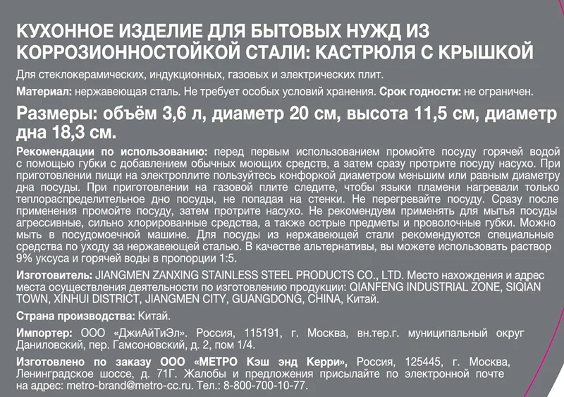 Кастрюля с крышкой 3,6л Tarrington House Stright, диаметр 20см, высота 11,5см. Это практичная металлическая посуда для кухни, дома и дачи, которая предназначена для приготовления и разогрева различных блюд. Кастрюля изготовлена из нержавеющей стали. Трехслойное капсульное дно с алюминиевым сердечником не деформируется при эксплуатации, плотно прилегает к конфорке и обеспечивает быстрый и равномерный нагрев. Кухонный инвентарь можно использовать на всех типах плит, включая индукционные, можно ставить в духовку (без крышки), можно мыть в посудомоечной машине. В комплект кастрюли входит крышка из жаропрочного стекла с ручкой, отверстием для выпуска пара и металлическим ободком. Посуда упакована в прозрачную термоусадочную пленку.