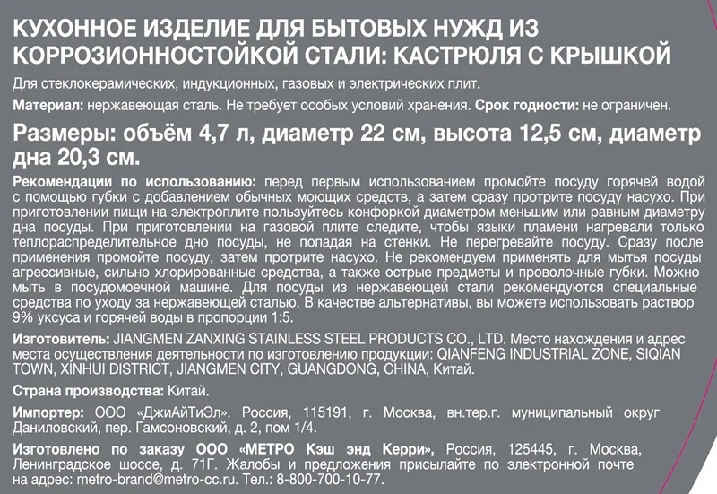 Кастрюля с крышкой 4,7л Tarrington House Stright, диаметр 22см, высота 12,5см. Это практичная металлическая посуда для кухни, дома и дачи, которая предназначена для приготовления и разогрева различных блюд. Кастрюля изготовлена из нержавеющей стали. Трехслойное капсульное дно с алюминиевым сердечником не деформируется при эксплуатации, плотно прилегает к конфорке и обеспечивает быстрый и равномерный нагрев. Кухонный инвентарь можно использовать на всех типах плит, включая индукционные, можно ставить в духовку (без крышки), можно мыть в посудомоечной машине. В комплект кастрюли входит крышка из жаропрочного стекла с ручкой, отверстием для выпуска пара и металлическим ободком. Посуда упакована в прозрачную термоусадочную пленку.