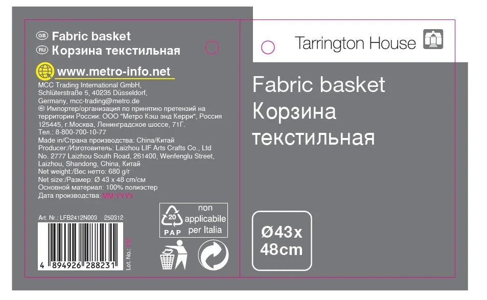 Отзывы о «Tarrington House Корзина для белья Laundry New текстильная круглая, 45 x 56см»