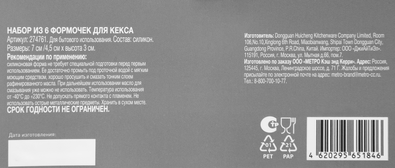 | Комплектация | форма для кекса - 6 шт. |