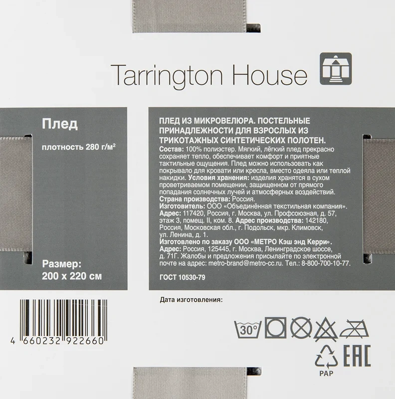 Tarrington House Плед графитный микрофибра велюр 280 г, 200 x 220 см выполнен из мягкого и приятного на ощупь материала. Он обеспечивает тепло и уют в холодную погоду, позволяет согреться в период, когда еще не начался отопительный сезон. Оптимальный размер модели позволяет полностью покрывать кровать, кресло или диван. Нейтральный дизайн в графитовом цвете придает пледу элегантный внешний вид. Он сочетается с разными стилями интерьера: от классики до современного лофта, хай-тека, конструктивизма. Плед обладает высокой прочностью и длительным сроком эксплуатации. Его легко стирать вручную или в машинке с использованием ополаскивающих средств. При этом текстиль сохраняет первоначальную мягкость и цвет на долгое время. Модель предназначена для повседневного использования, так как обладает хорошими теплоизоляционными свойствами. Она надолго сохраняет тепло и позволяет чувствовать себя комфортно. Плед можно использовать как в спальне, так и в гостиной или на открытом воздухе: во время пикника, барбекю, прогулки. Плотный материал достаточно легкий и воздухопроницаемый, поэтому позволяет коже дышать и не перегреваться.