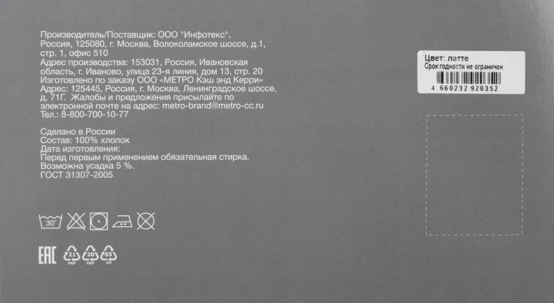 Tarrington House Пододеяльник в цвете латте, трикотаж, на молнии, 200 x 210 см выполнен из высококачественного трикотажного материала, мягкого и приятного на ощупь. Пододеяльник выгодно отличается стильным исполнением, что делает его отличным выбором для современной и классической спальни. Основные преимущества: — Высокое качество материала. Трикотажный состав пододеяльника Tarrington House обеспечивает прочность и долговечность изделия. Он не только приятен на ощупь, но и устойчив к истиранию, сохраняя свою форму и цвет даже после многократных стирок. — Удобство использования. Пододеяльник оснащен практичной молнией, которая позволяет легко и быстро надевать и снимать пододеяльник с одеяла. — Оригинальное сочетание цветов. Цвет пододеяльника Tarrington House является универсальным и легко сочетается с разнообразными оттенками интерьера спальни. Он помогает создать атмосферу уюта и умиротворения. — Простота ухода. Пододеяльник Tarrington House легко стирается в стиральной машине при низких температурах, что делает его уход простым и удобным. Высокая степень износостойкости материала позволяет использовать изделие на протяжении многих лет без потери внешнего вида и качества. Пододеяльник Tarrington House — это не только практичный элемент постельного белья, но и стильный аксессуар, который добавит шарм и уют в спальню. Обладая высоким качеством, комфортом использования и привлекательным дизайном, он является отличным выбором для тех, кто ценит комфорт и стиль в своем доме. Рекомендуется постельное издели?? стирать в машинке при температуре не выше 40 градусов, избегая использования отбеливающих средств. После стирки следует высушить пододеяльник на воздухе или использовать низкую температуру сушилки для предотвращения усадки изделия.