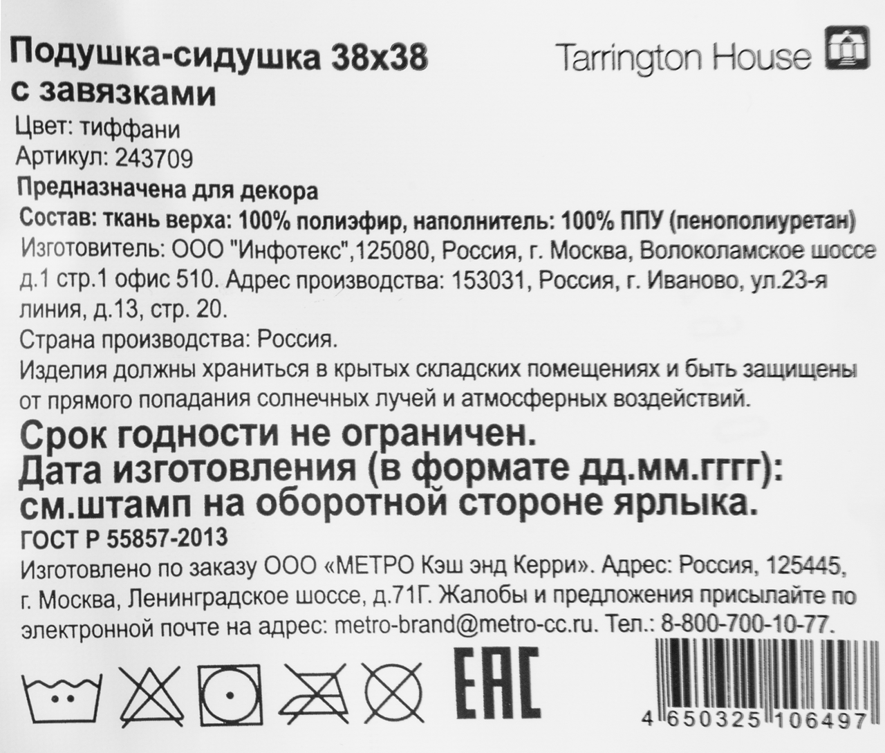 | Комплектация | подушка для мебели - 1 шт. 38х38см |
