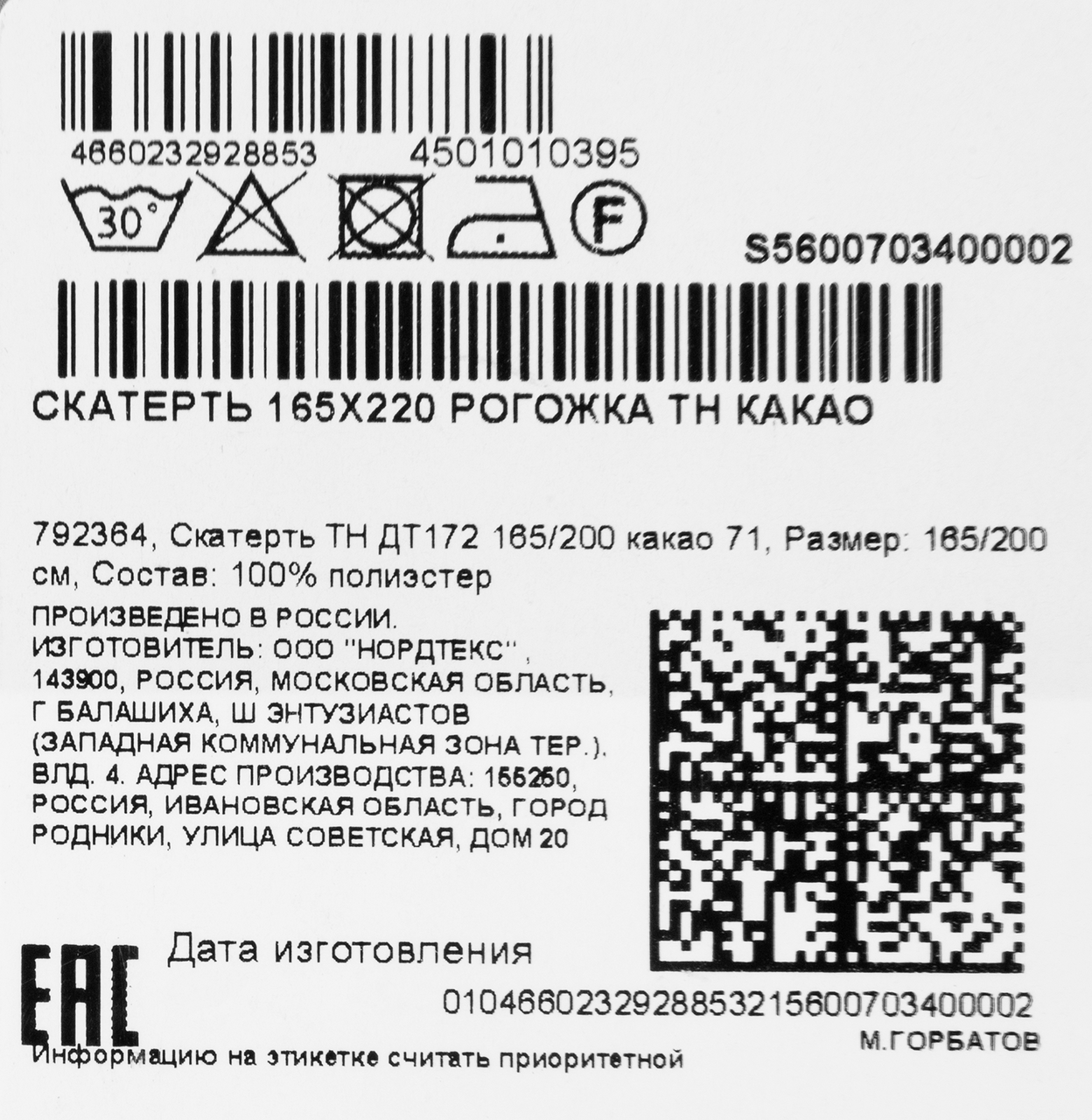 | Комплектация | скатерть - 1 шт. 165х220см |