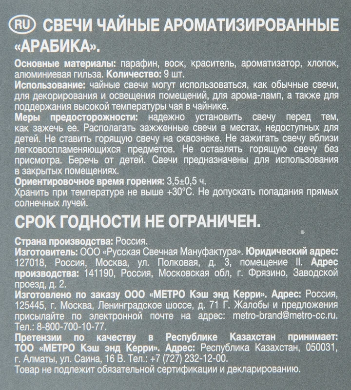 Tarrington House Свеча Чайная ароматическая Арабика, 9шт предназначена для освещения и украшения помещений. Комплект аксессуаров для интерьера создает уютную романтическую атмосферу, декорирует праздничный стол, интерьер квартиры или загородного дома. Модель подходит, в том числе, для принятия ванны, йоги и медитации, погружения в полный релакс. Свеча испускает аромат кофе, который наполняет помещение нежностью и теплом. Он вызывает ощущение безопасности, комфорта, убирает излишнюю тревожность, чувство беспокойства и подавленности. Стильный элемент интерьера гармонично вписывается в различные стили: от классики, модерна до скандинавского или рустикального. Они также хорошо создают акценты и добавляют теплоту к минималистическому интерьеру. Элегантный дизайн и привлекательное исполнение создают изменчивую игру света и тени. Свечи горят аккуратно, не текут и не потрескивают, а время их горения составляет около 3-4 часов. Аксессуары можно расположить в гостиных и спальнях, мансарде или ванной комнате. Благодаря компактному размеру они легко помещаются на мебели, в серванте или на журнальном столике. Дополнительно их можно поставить в оригинальный стеклянный подсвечник, аромалампу, фигурный чайник или фондю, в зависимости от назначения, настроения и общего антуража в помещении. Свечи не рекомендуется ставить рядом с легковоспламеняющимися предметами. Хранить изделие необходимо вдали от прямых солнечных лучей и детей.