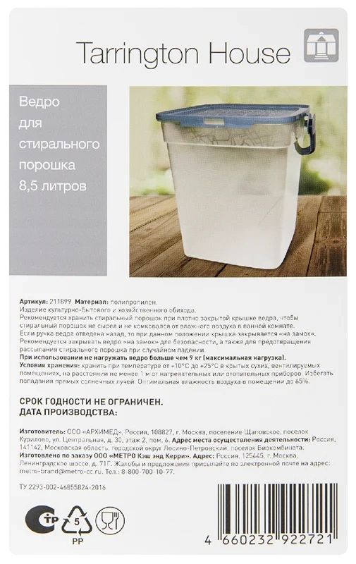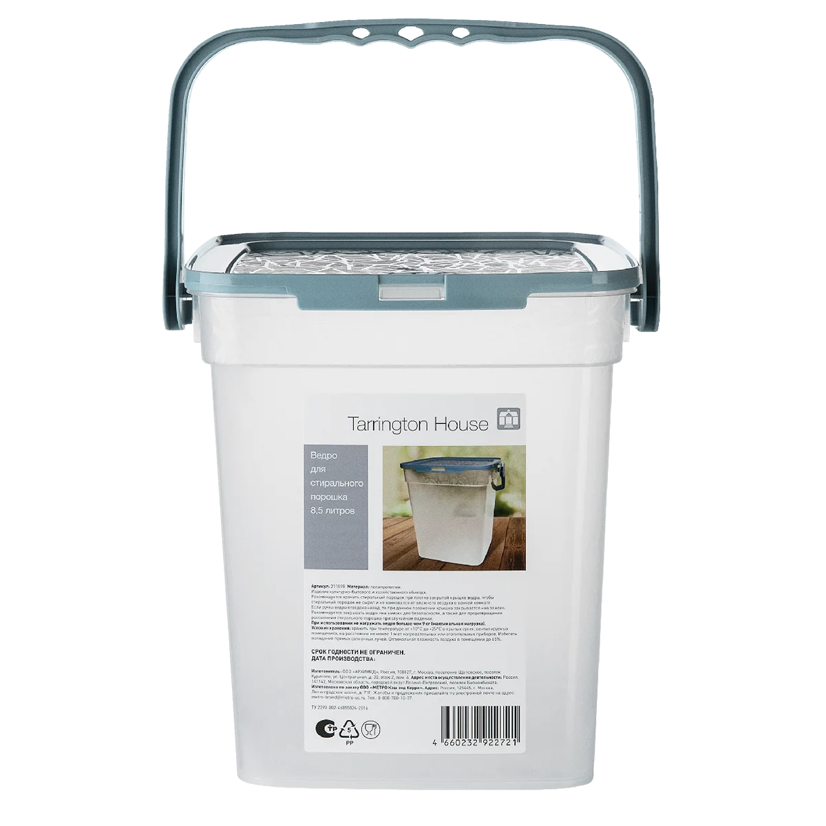Tarrington House Ведро для стирального порошка 35 x 25 x 26 см, 8.5 л — удобная емкость для хранения сыпучих моющих средств. Плотно прилегающая крышка, защищает порошок от проникновения влаги и не позволяет содержимому контейнера рассыпаться при случайном падении. Плотно закрытая крышка позволяет сохранить стиральный порошок от влажного воздуха в ванной комнате. Если ручка ведра отведена назад, то при данном положении крышка закрывается на замок. Ребенок не сможет самостоятельно открыть крышку, что убережет от неприятностей, связанных с детским любопытством. Удобная ручка помогает переносить емкость и засыпать порошок в стиральную машину.