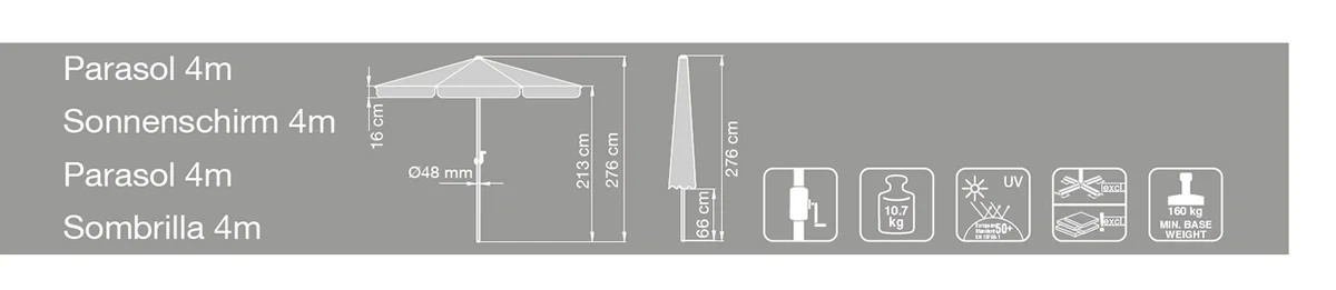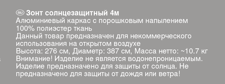 Tarrington House Зонт Merida, 4 м станет идеальной крышей как для летнего кафе, так и для личного пользования на даче, в саду на террасе или веранде. Это идеальное средство защиты от палящего солнца. Его устанавливают между лежаками (на пляже) или столиками (в саду, летнем кафе), а устойчивость изделия зависит от качества центральной опоры. Зонт способен защитить от жары двух и более человек одновременно благодаря продуманной конструкции. Легко отстирывающийся материал купола (полиэстер) не доставит хлопот в уходе за изделием.