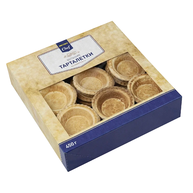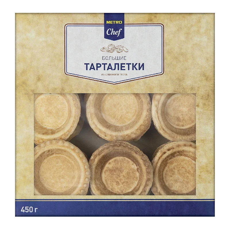 Тарталетки большие Metro Chef из слоеного теста, 450 г, 27 шт. — экологичный продукт без ГМО, который содержит муку из пшеницы, воду, маргарин, натуральный краситель Аннато. Тарталетки наполняют различной начинкой: сырной, мясной, грибной или фруктовой. Продукт можно готовить в духовке или микроволновой печи, а также создавать с его помощью холодные закуски для фуршетного стола. Тарталетки станут легким ужином с морепродуктами, слабосолеными семгой, форелью или тунцом, красивым декором для праздничного стола с наполнителями в виде джема, ягод, фруктов, шоколада, мороженого. Из них получаются вкусные закуски из куриного филе, грибов, сыра и зелени. Вид начинки в тарталетках подчеркнет брусника или клюква для курицы, зерна граната или горошка для ветчины или гусиной печени.