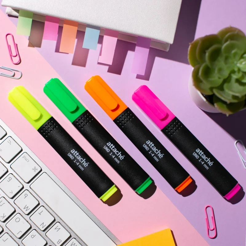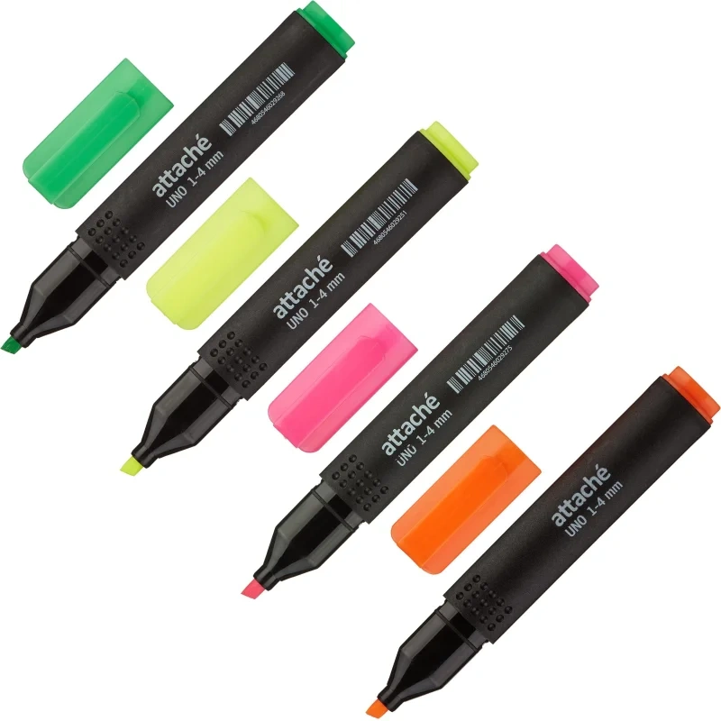 Набор текстовыделителей Attache Economy Uno - это отличный выбор для любителей рисования маркерами. Четыре цвета в наборе: зеленый, желтый, оранжевый, розовый. Текстовыделитель поможет выделять самое важное в документах или просто тексте, и Вы сможете обработать и не забыть больше полезной информации. Текстовыделитель обладает экономным расходом чернил. Светоустойчивые чернила на водной основе не выцветают даже на открытом солнце и не размазываются в процессе. Чернила не промокают бумагу. Цвет колпачка соответствует цвету чернил. Чернила не имеют запах. Маркер обладает плоской формой корпуса. Скошенный наконечник имеет толщину линии письма от 1 до 4 мм, что обеспечивает удобство при работе с текстом, напечатанным мелким шрифтом, или таблицами.