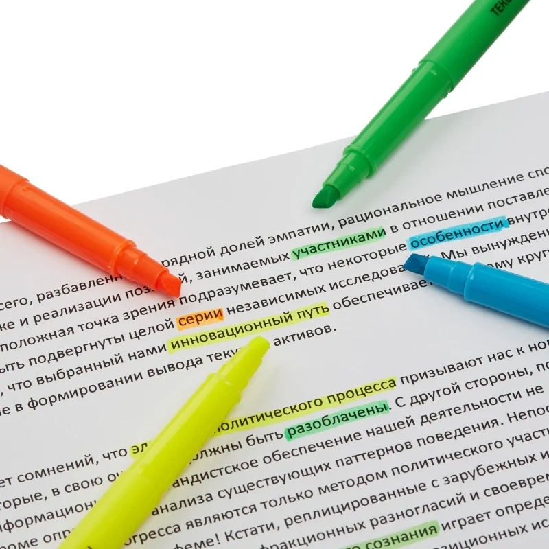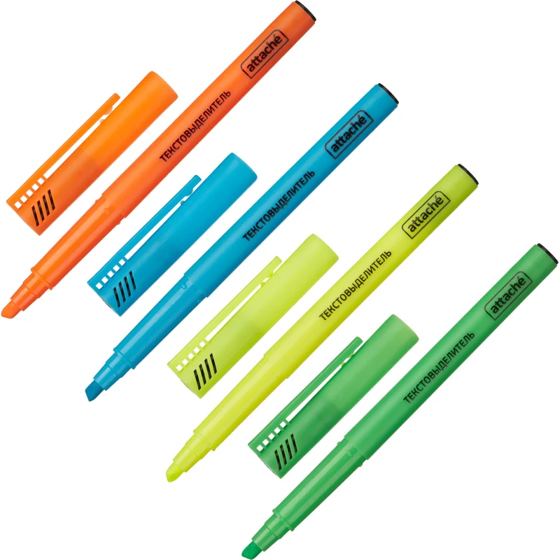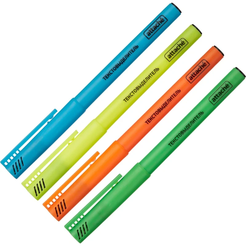 Набор текстовыделителей Attache - это отличный выбор для любителей рисования маркерами. Текстовыделитель поможет выделять самое важное в документах или просто тексте, и Вы сможете обработать и не забыть больше полезной информации. Помимо стильного дизайна данный текстовыделитель отличает безупречное качество. Текстовыделитель обладает экономным расходом чернил. Светоустойчивые чернила на водной основе не выцветают даже на открытом солнце и не размазываются в процессе. Чернила не промокают бумагу. В наборе 4 цвета: желтый, зеленый, оранжевый, синий. Цвет корпуса соответствует цвету чернил. Чернила не имеют запах. Корпус в виде ручки с клипом для кармана. Скошенный наконечник имеет толщину линии письма от 1 до 3 мм, что обеспечивает удобство при работе с текстом, напечатанным мелким шрифтом, или таблицами.