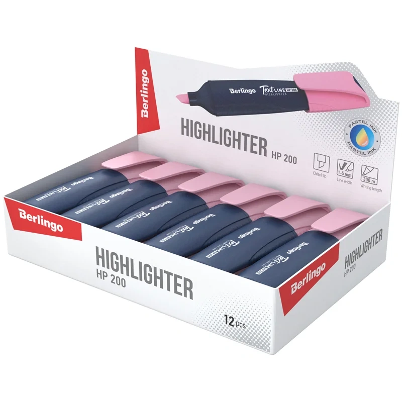Текстовыделитель 'Berlingo' предназначен для маркировки текста на всех типах бумаги. Стильный дизайн, эргономичный корпус. Колпачок в цвет чернил. Скошенный пишущий узел позволяет варьировать ширину письма от 1 до 5мм. Удобный клип. Пастельные чернила на водной основе. Упакованы в дисплей-бокс по 12 шт.