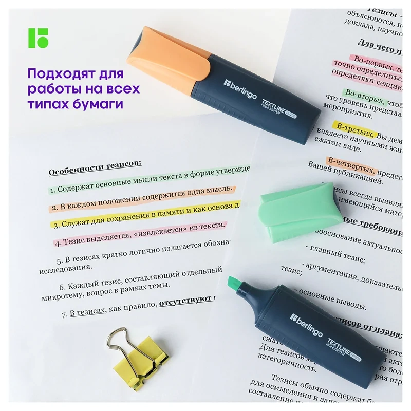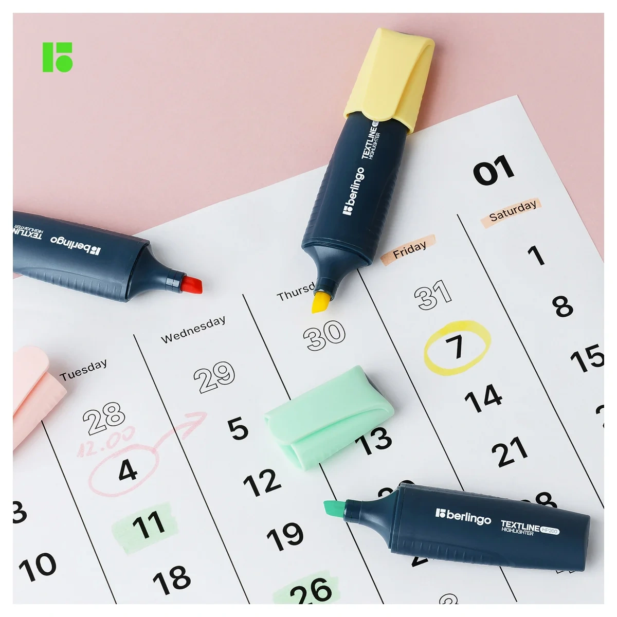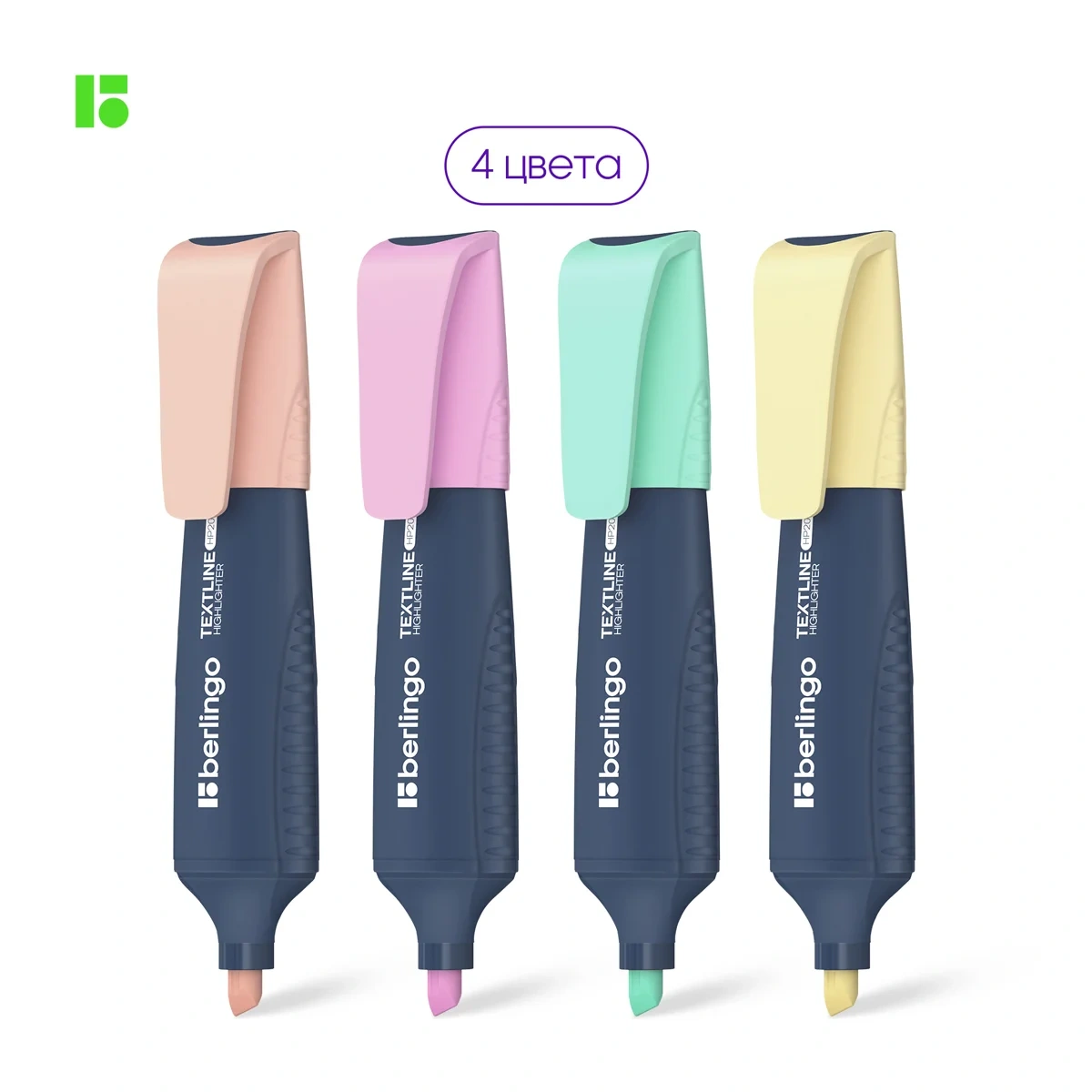 Набор текстовыделителей 'Berlingo', 4 цвета,предназначены для маркировки текста на всех типах бумаги. Стильный дизайн, эргономичный корпус. Колпачок в цвет чернил. Скошенный пишущий узел позволяет варьировать ширину письма от 1 до 5мм. Удобный клип. Пастельные чернила на водной основе. Пакет с европодвесом