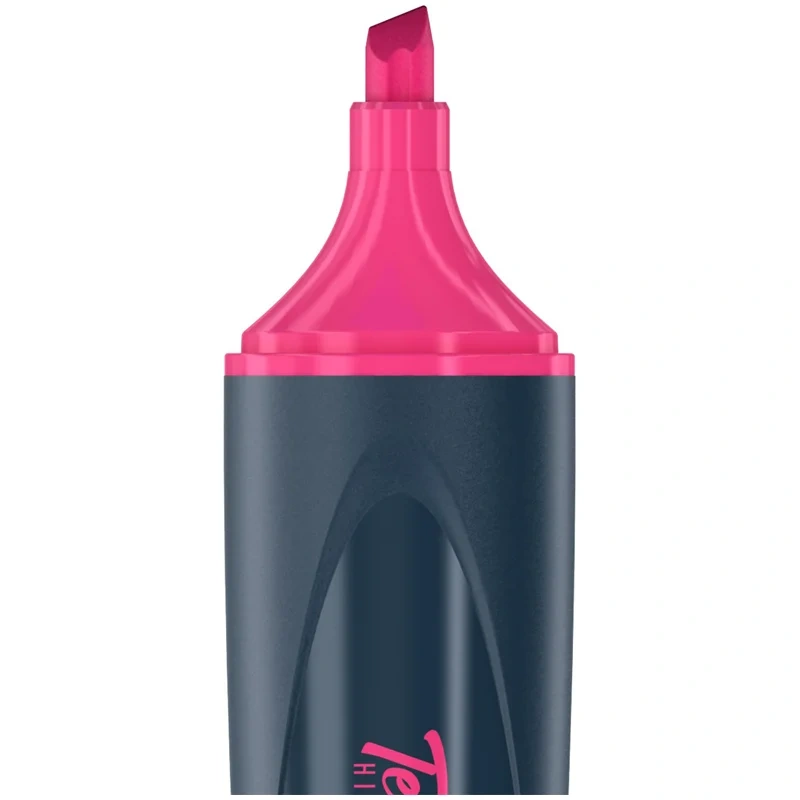 Текстовыделители с флуоресцентными чернилами на водной основе. Выполнены в оригинальном корпусе графитового цвета с сочетанием матовых и глянцевых поверхностей. Яркие элементы колпачка и нанесение соответствуют цвету чернил. Длина непрерывной линии письма - 300 метров. Скошенный наконечник с толщиной линии от 1 до 5 мм. Цвет чернил - розовый. Упакованы в картонную коробку-дисплей по 12 штук.