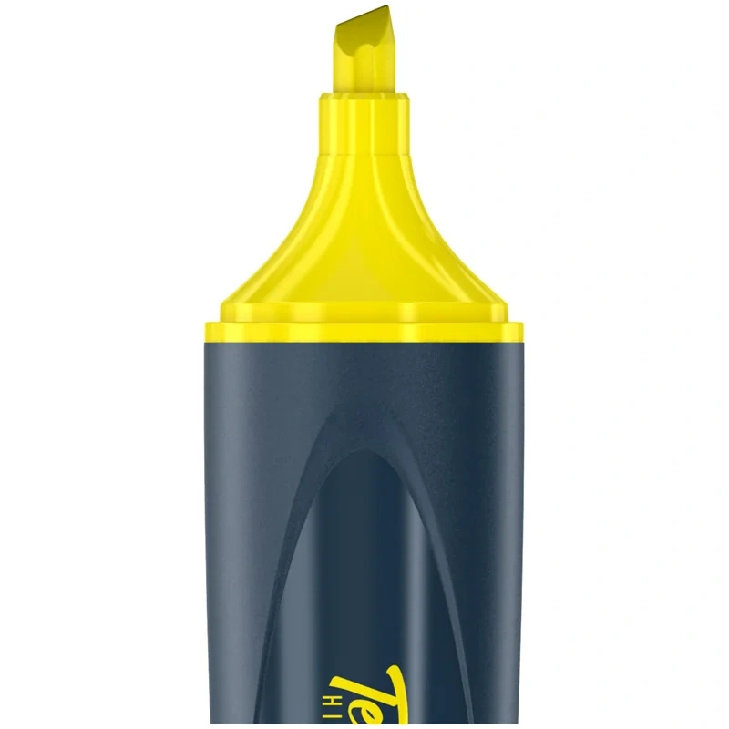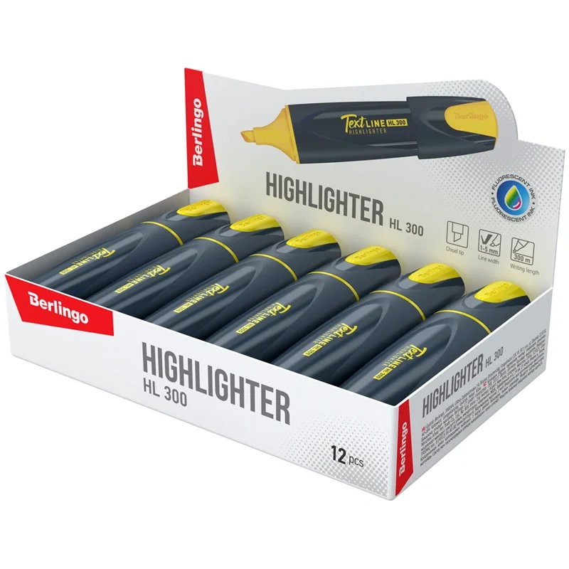 Текстовыделители с флуоресцентными чернилами на водной основе. Выполнены в оригинальном корпусе графитового цвета с сочетанием матовых и глянцевых поверхностей. Яркие элементы колпачка и нанесение соответствуют цвету чернил. Длина непрерывной линии письма - 300 метров. Скошенный наконечник с толщиной линии от 1 до 5 мм. Цвет чернил - жёлтый. Упакованы в картонную коробку-дисплей по 12 штук.