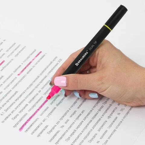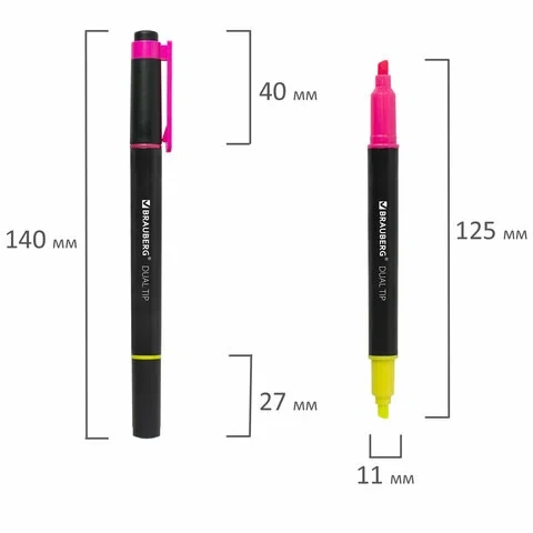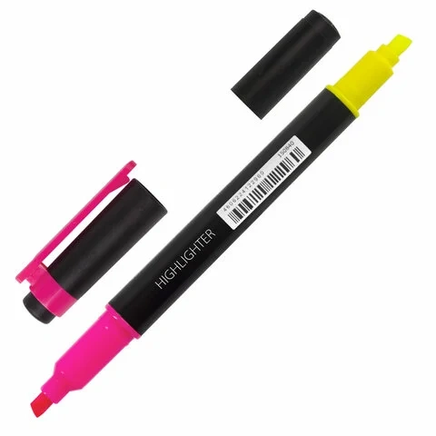 Двусторонний текстовыделитель неоновых цветов - желтый/розовый - обладает круглой формой корпуса диаметром 11 мм. Корпус тектовыделителя оснащен удобной зоной захвата. Скошенный наконечник имеет толщину линии письма от 1 до 4 мм, что обеспечивает удобство при работе с текстом, напечатанным мелким шрифтом, или таблицами. Текстовыделитель обладает экономным расходом чернил. Светоустойчивые чернила на водной основе не выцветают даже на открытом солнце и не размазываются в процессе использования. Изделие не перезаправляется. Цвет клипа соответствует цвету чернил.