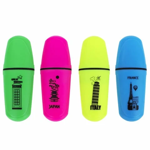 Текстовыделители неоновых цветов: желтый, зеленый, розовый, голубой, имеют овальную форму корпуса, диаметр которого 27 мм. Скошенный наконечник имеет толщину линии письма от 1 до 5 мм, что обеспечивает удобство при работе с текстом, напечатанным мелким шрифтом, или таблицами. Благодаря особой водной основе чернил текстовыделитель не высыхает без колпачка в течение 4 часов. Текстовыделитель обладает экономным расходом чернил, при этом длина линии письма достигает 250 метров. Чернила быстро впитываются и тем самым предотвращают размазывание в процессе использования. Цвет колпачка и корпуса текстовыделителя соответствует цвету чернил. Поставляются в тубе по 50 штук, отлично подходят для размещения в розничном магазине.