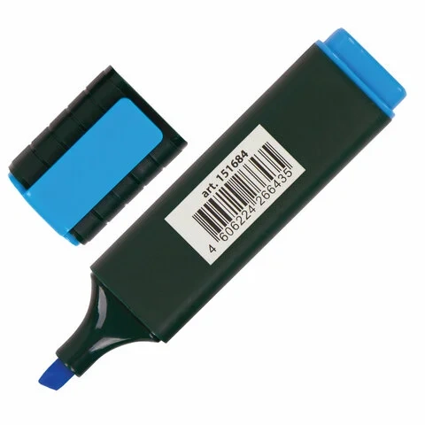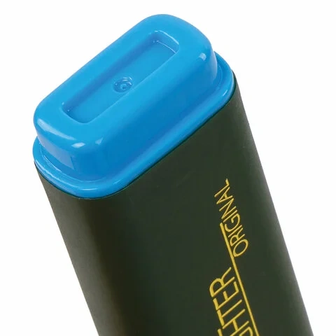 Текстовыделитель голубого цвета имеет плоскую форму корпуса, диаметр которого 25 мм. Скошенный наконечник имеет толщину линии письма от 1 до 5 мм, что обеспечивает удобство при работе с текстом, напечатанным мелким шрифтом, или таблицами. Благодаря особой водной основе чернил текстовыделитель не высыхает без колпачка в течение 8 часов. Текстовыделитель обладает экономным расходом чернил, при этом длина линии письма достигает 300 метров. Чернила быстро впитываются и тем самым предотвращают размазывание в процессе использования. Светоустойчивые чернила не выцветают даже на открытом солнце. Цвет клипа текстовыделителя соответствует цвету чернил.
