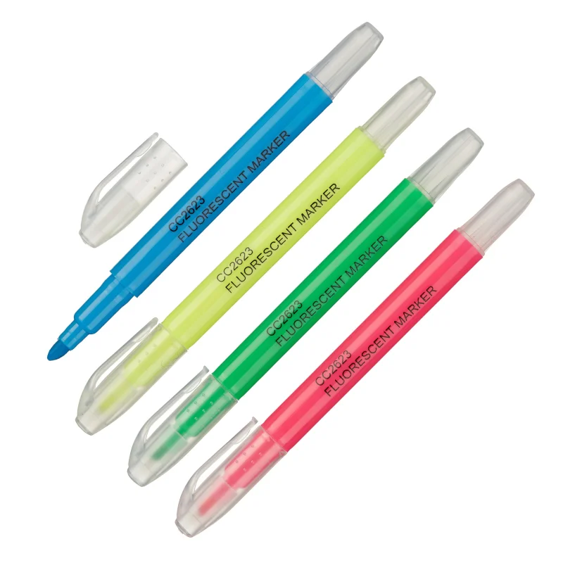 Набор текстовыделителей, предназначенных для маркировки текста на различных типах бумаги. Корпус изготовлен из пластика, цвет корпуса соответствует цвету чернил. Скошенный стержень позволяет проводить линии толщиной от 1 до 4,5 мм. В наборе 4 флуоресцентных цвета: желтый, розовый, голубой,