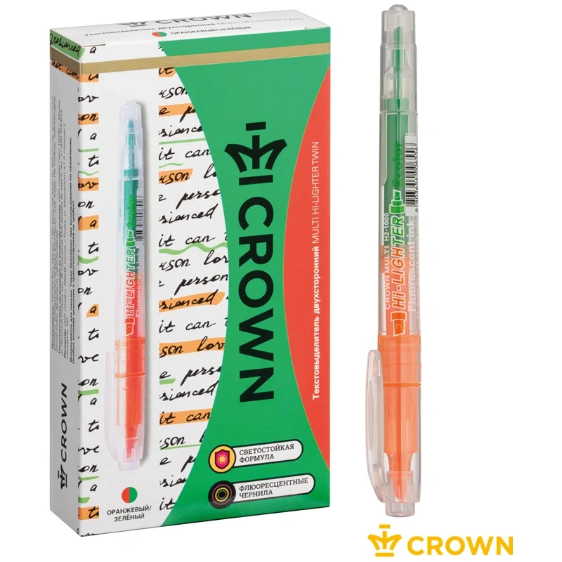 Текстовыделитель Crown H2-1000 оранжевый/зеленый, 1-3 мм, скошенный наконечник, круглый наконечник, двухсторонний