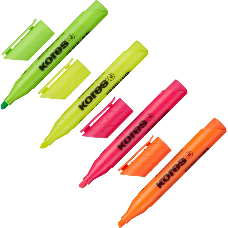 Набор текстовыделителей Kores набор 36040. Высококачественные текстовыделители со скошенным наконечником, обладают оригинальным дизайном корпуса, колпачком с клипом. В наборе 4 ярких флуоресцентных цвета: желтый, розовый, оранжевый, зеленый. Универсальные чернила на водной основе подходят для всех видов бумаги, в том числе для ксерокопия, факсов и документов, распечатанных на струйных принтерах. Увеличенный запас чернил обеспечивает более длительный срок службы. Цвет корпуса и колпачка соответствует цвету чернил. Чернила светоустойчивые. Ширина линии письма: 1-5мм. Произведено в Чешской Республике. Снятый колпачок не потеряется благодаря тому, что во время работы его можно надевать на верхнюю часть маркера.
