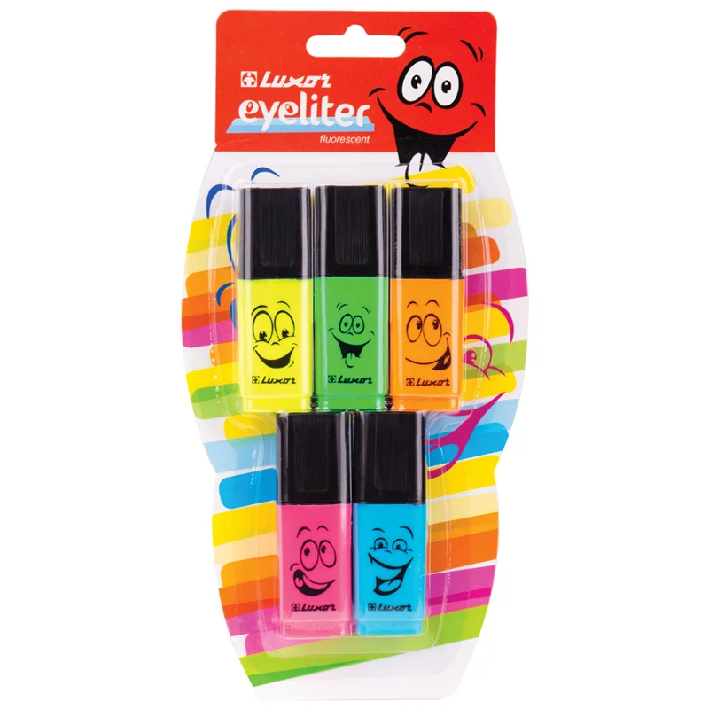 Набор мини текстовыделителей Luxor 'Eyeliter' - это пять ярких текстовыделителей с различными эмоциями на корпусе. Выбери не только свой цвет , но и своё настроение на целый день. Компактный размер идеально подходит для пенала или сумочки. Помимо привлекательного дизайна, текстовыделители ярко выделяют, быстро сохнут и не оставляют разводов. Скошенный наконечник. Ширина линии письма 1-4 мм. Цвет чернил - желтый, зеленый, оранжевый, розовый и синий.