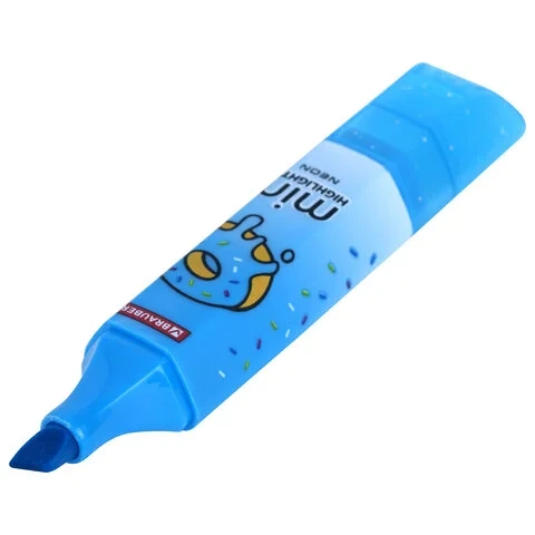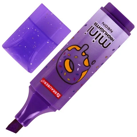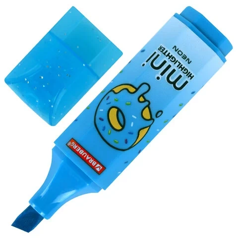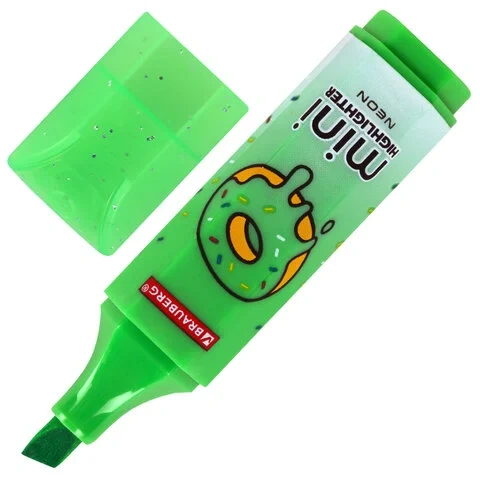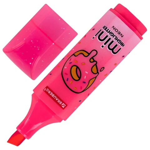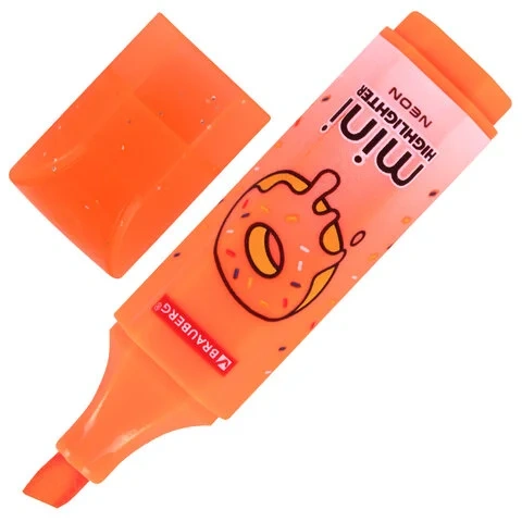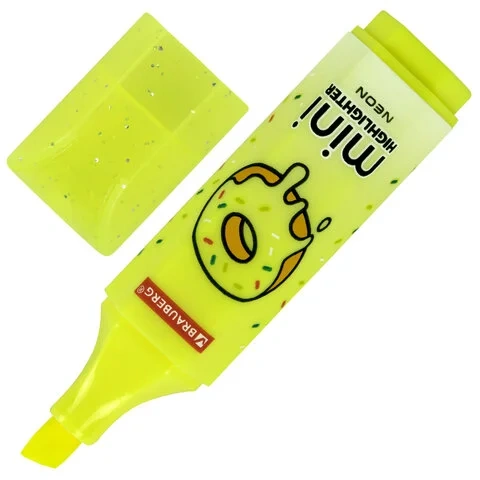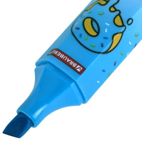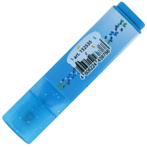 Текстовыделитель обладает экономным расходом чернил, при этом длина линии письма достигает 300 метров. Чернила быстро впитываются и тем самым предотвращают размазывание в процессе использования. Цвет колпачка и корпуса текстовыделителя соответствует цвету чернил. Необычный колпак с блестками отлично дополняется принтами в виде ярких пончиков. Поставляются в тубе по 40 штук, отлично подходят для размещения в розничном магазине.