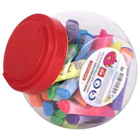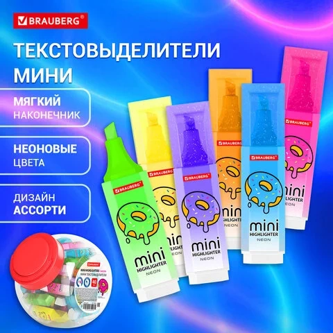 Текстовыделитель мини с принтами BRAUBERG 'NEON', АССОРТИ В ПЛАСТИКОВОЙ БАНКЕ, 1-5 мм, 152535