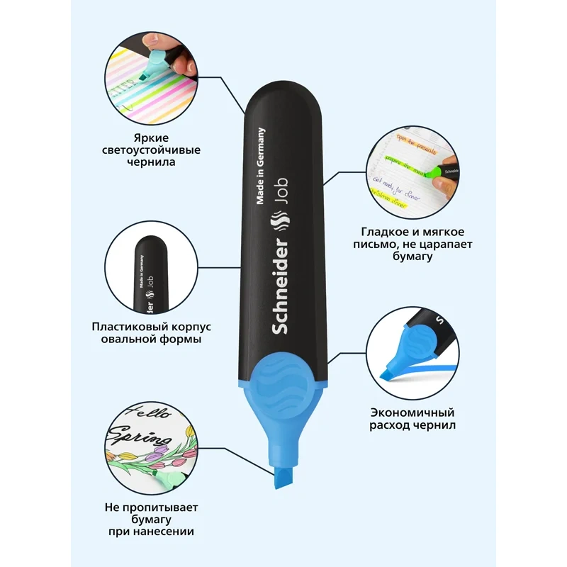 Универсальный текстовыделитель Schneider Job имеет светостойкие чернила яркого неонового голубого цвета на водной основе. Толщина линии варьируется от 1 до 5 мм. Упаковка: картонная коробка по 10 штук. Schneider Job подходит для различных типов бумаги. Текстовыделитель представлен со скошенным наконечником. Диаметр овального пластикового корпуса составляет 24 мм. Цвет колпачка и элементов корпуса соответствует цвету чернил.