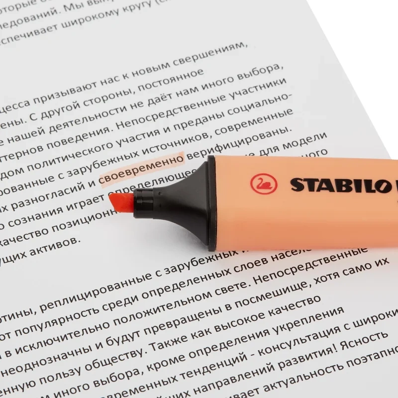 Текстовыделитель Stabilo Boss Pastel — классика в пастельных тонах, ориентированный на течение в индустрии моды. Выполненный в спокойной цветовой гамме. Краски ассоциируются с летом, солнцем, теплом. Им можно выделять, писать, подчеркивать, рисовать. Помимо достойного дизайна, Stabilo Boss Pastel отличает безупречное качество. Текстовыделитель минимум 4 часа сохраняет работоспособность без колпачка, а при закрытом колпачке восстанавливает свои свойства! Непревзойденная длина линии позволяет выделить огромное количество информации. Высокая светостойкость чернил обеспечивает сохранность линий на долгие годы. Прочный, износоустойчивый наконечник гарантирует постоянство толщины линии на протяжении всего срока службы. Цвет чернил: персиковый. Толщина линии письма: 2–5 мм.
