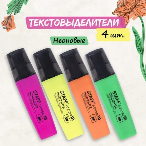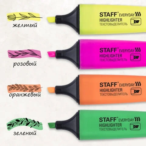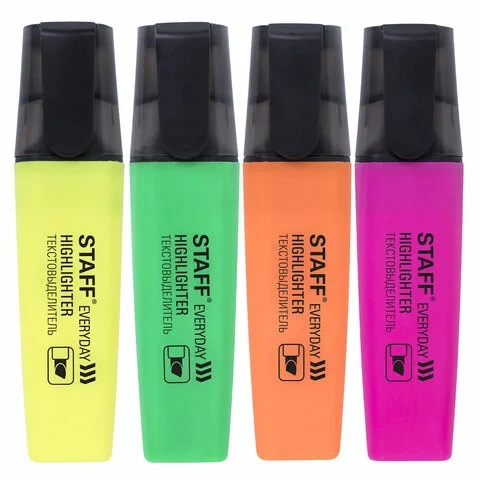 Текстовыделители STAFF 'Everyday' - вещь незаменимая для каждого дня. Что-то выделить, пометить, отметить - очень удобно. Яркие, широкие, компактные, они всегда способны выручить в трудную минуту. Приобретайте товар в нашем интернет-магазине!