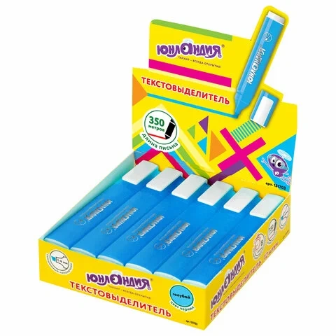 Текстовыделитель голубого цвета имеет плоскую форму корпуса, диаметр которого 18 мм. Неоновый цвет позволяет ярко выделить важное в тексте. Скошенный наконечник имеет толщину линии письма от 1 до 4 мм, что обеспечивает удобство при работе с текстом, напечатанным мелким шрифтом, или таблицами. Благодаря особой водной основе чернил текстовыделитель не высыхает без колпачка в течение 8 часов. Текстовыделитель обладает экономным расходом чернил, при этом длина линии письма достигает 350 метров. Чернила быстро впитываются и тем самым предотвращают размазывание в процессе использования. Светоустойчивые чернила не выцветают даже на открытом солнце. Цвет колпачка и корпуса соответствует цвету чернил.