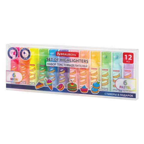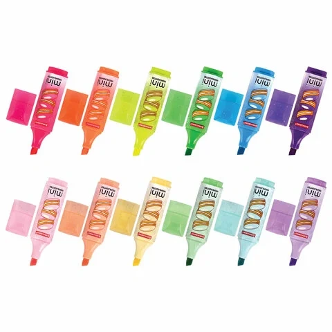 Набор текстовыделителей мини с принтами, 12 ЦВЕТОВ, BRAUBERG, 6 неоновых цветов + 6 пастельных цвето