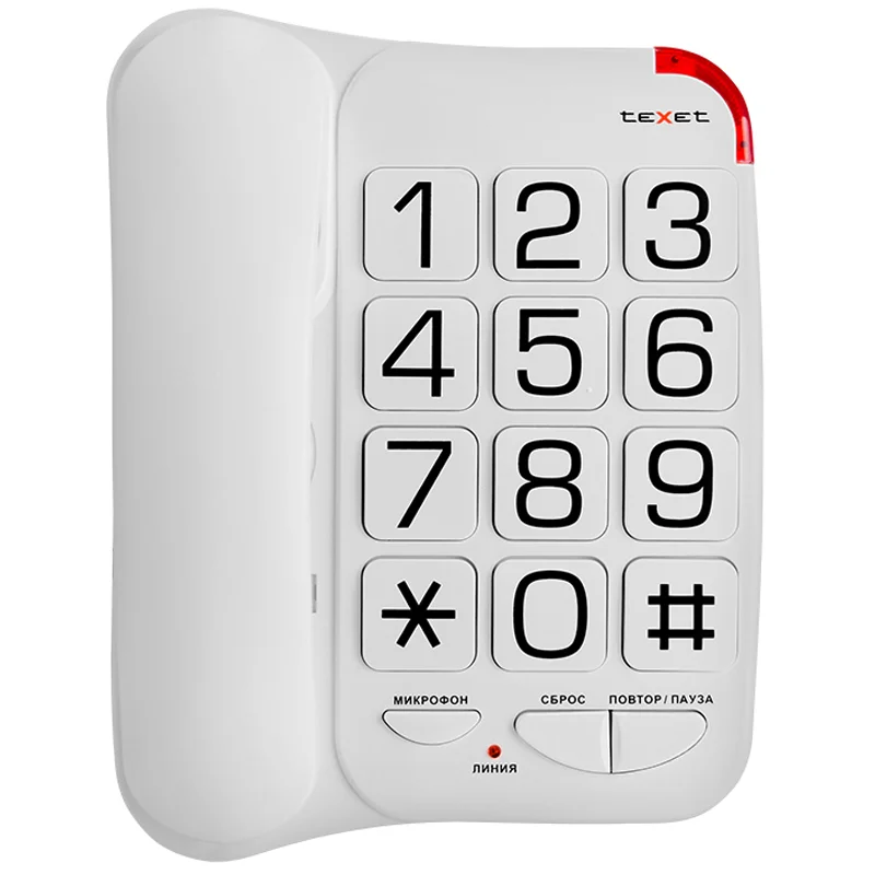 Большие кнопки, повтор последнего набранного номера, регулировка громкости вызывного сигнала, световая индикация вызова. Отключение микрофона. Пауза. Настольно-настенное исполнение.
